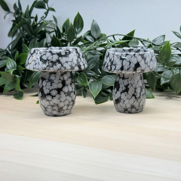 Kaarsenhouder voor een waxinelichtje gemaakt van sneeuwvlok obsidiaan. Geslepen in de vorm van een paddenstoel. De houders wegen rond de 220 gram en zijn 7.5 cm in hoogte.