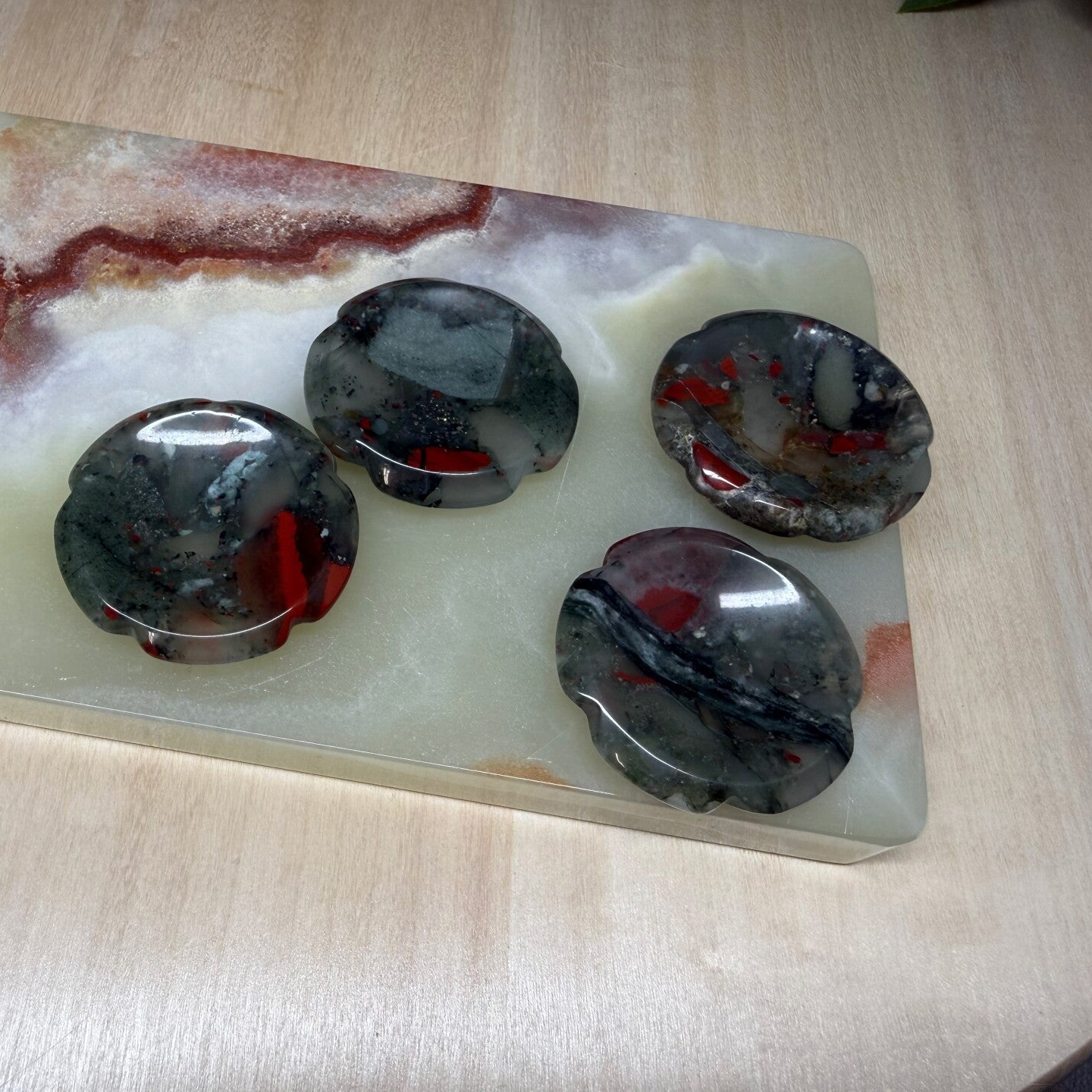 Worry stone van heliotroop of bloedsteen in bloemvorm.