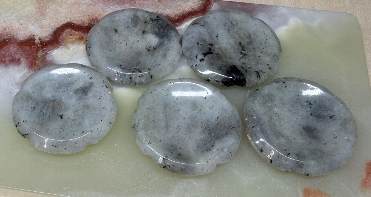 Worry stone van labradoriet in bloemvorm.