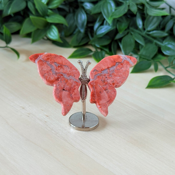 De vlinder heeft vleugels van cotton candy agaat. De vlinder heeft een hoogte van 6 cm en breedte van 8 cm.