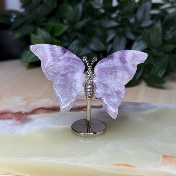 Vlinder met vleugels van Chevron amethist oftewel dream amethist, een combinatie van amethist en agaat.