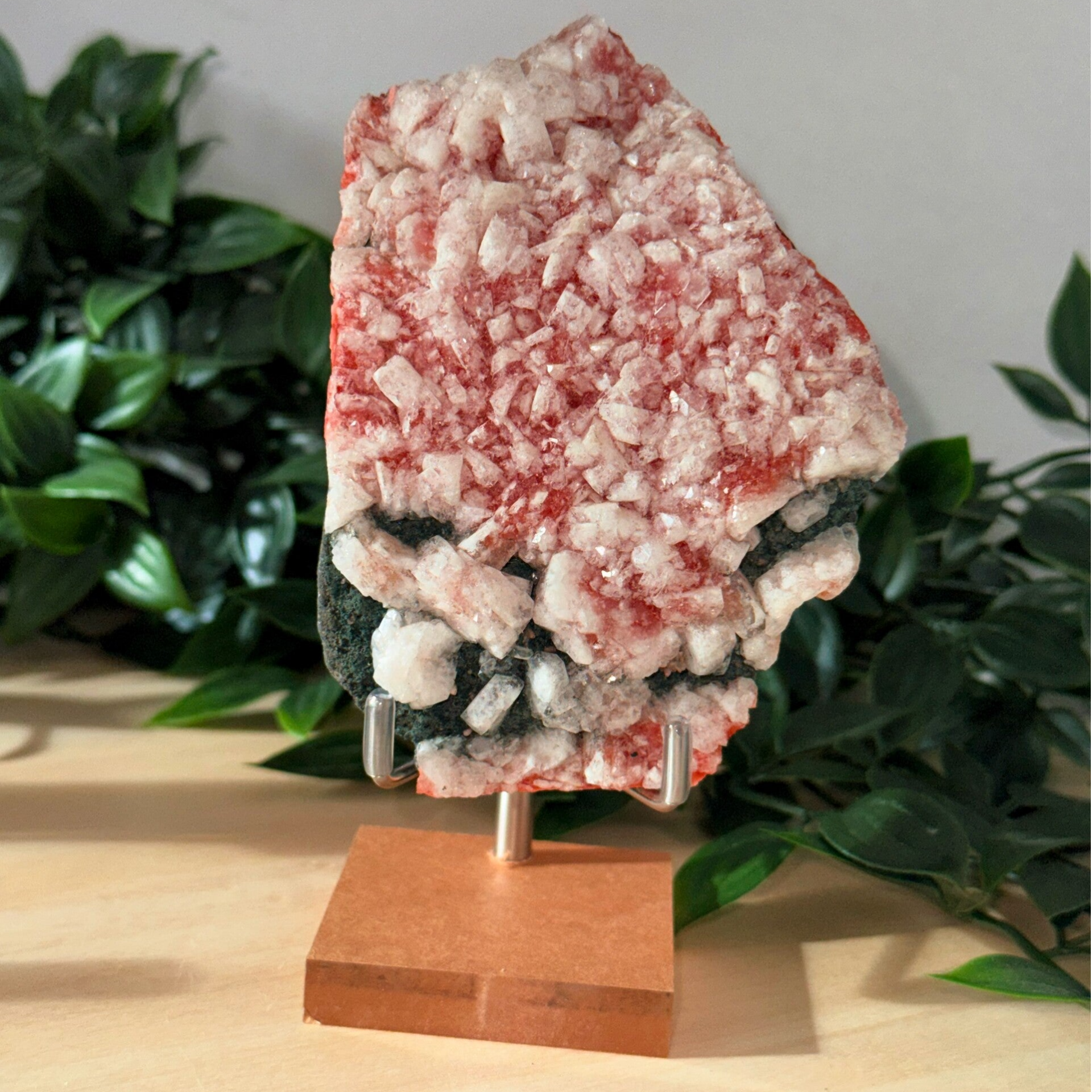 Mooi stuk apofylliet uit India. Ongeveer 12 bij 6 cm. Inclusief houder. Weegt circa 400 gram.