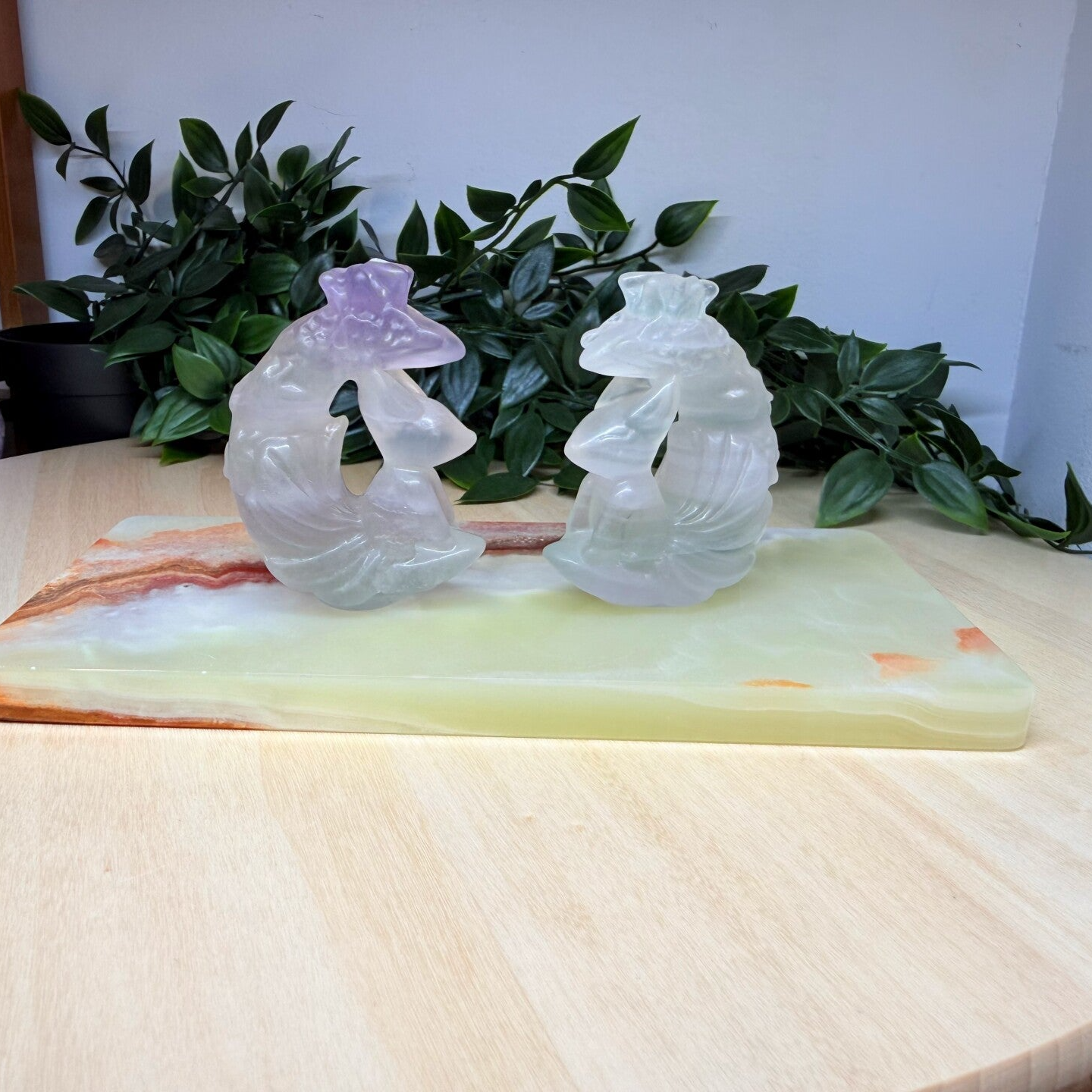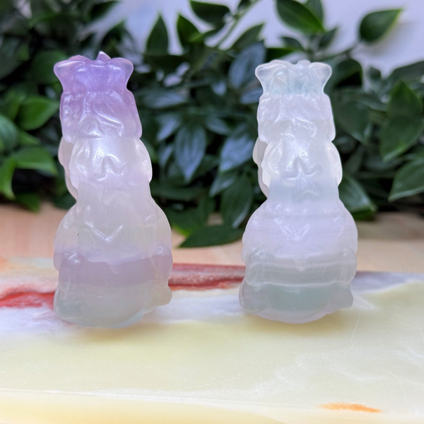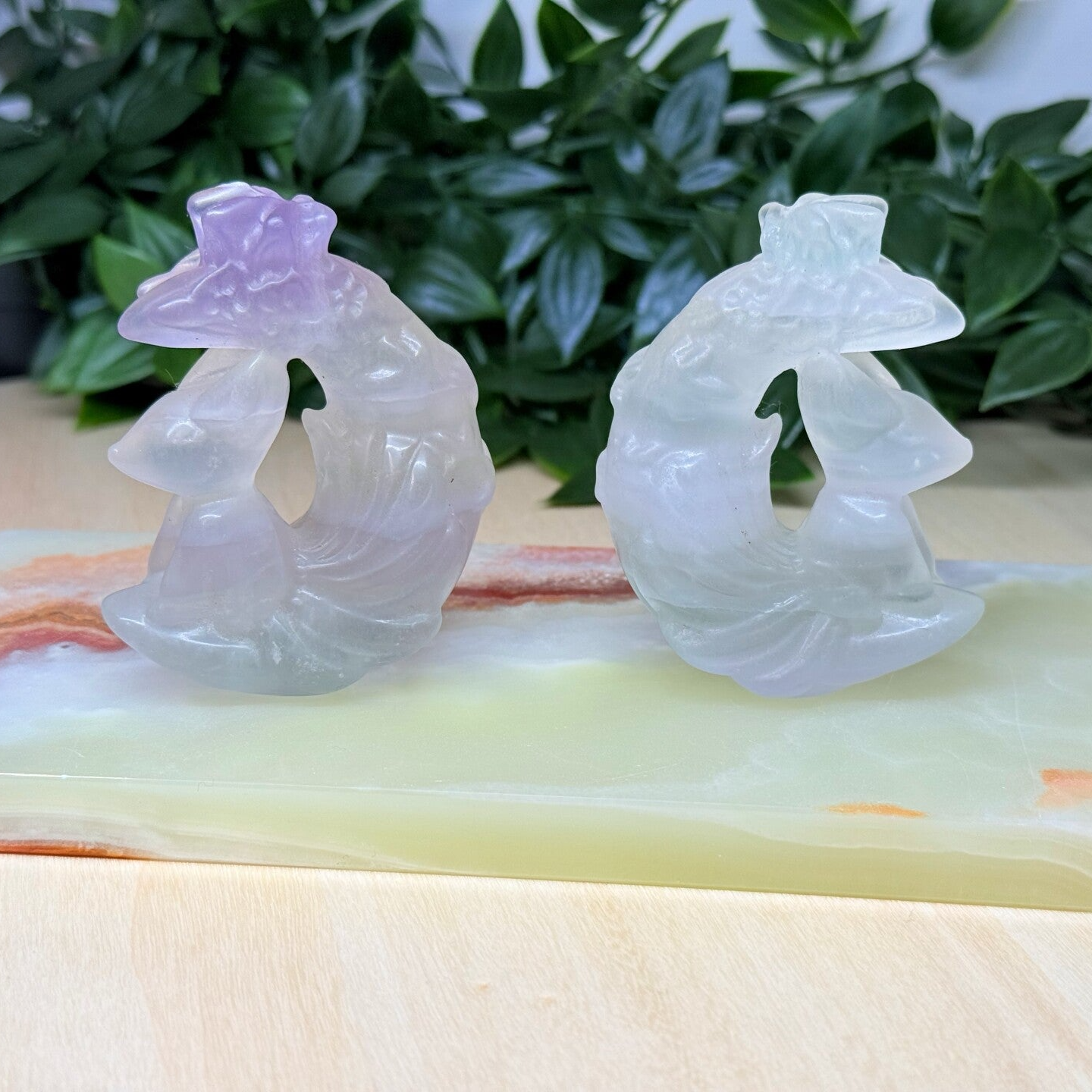Leuke carving van vos en maan gemaakt met Yttrium fluoriet. De carving is zo een 7 cm in de hoogte. Bij aankoop ontvangt u een van de carvings te zien op de foto's.