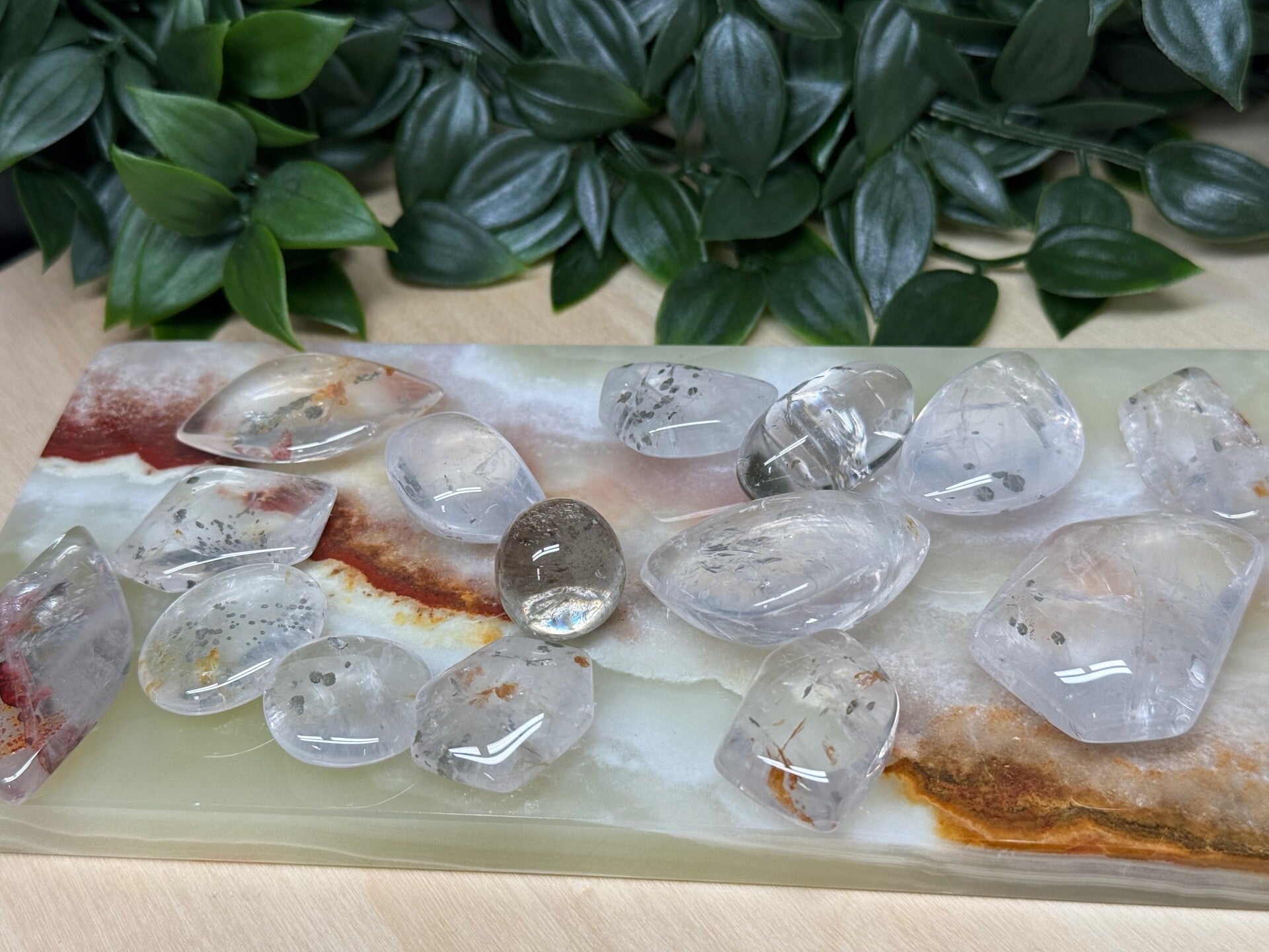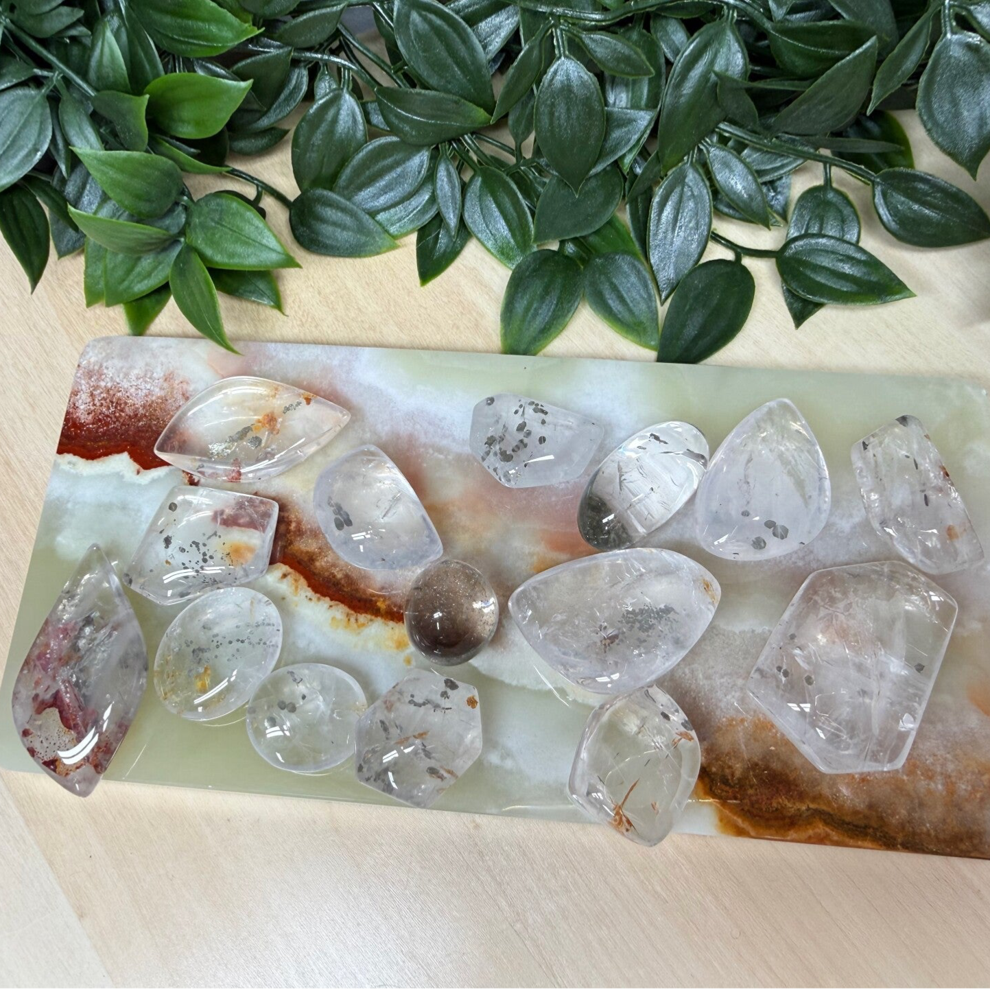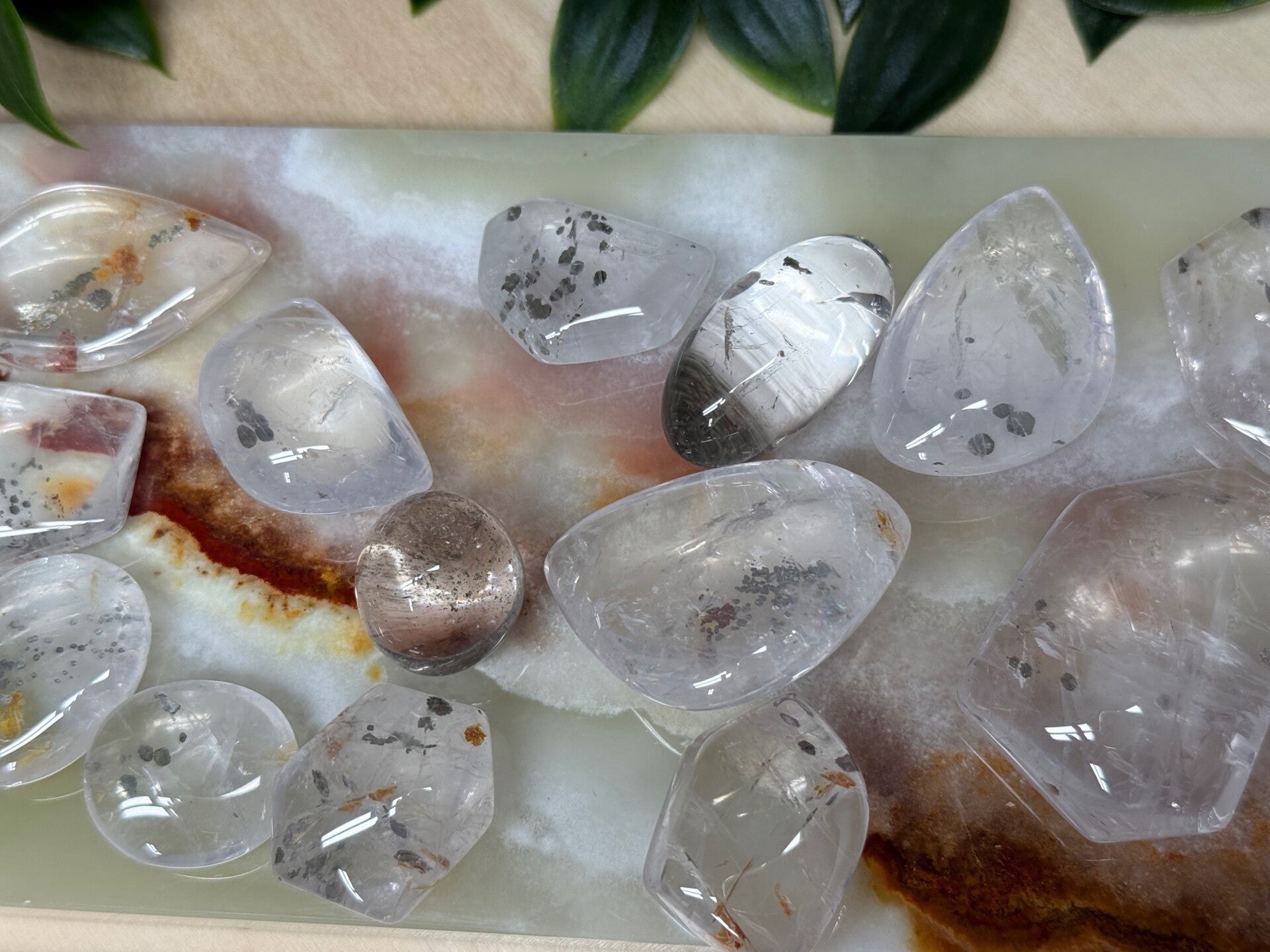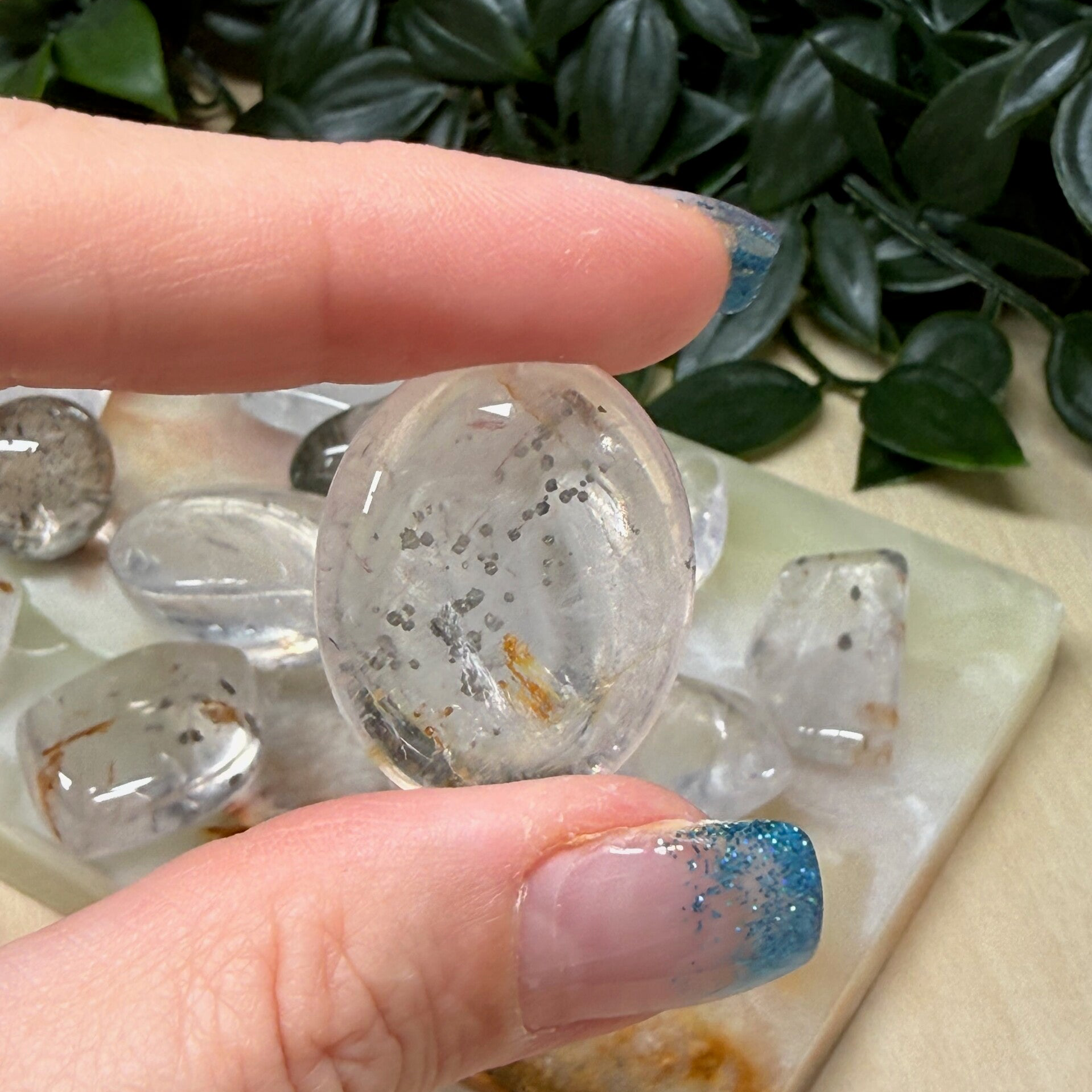 De heldere tot melkachtige kwarts vormt een serene basis waarin de goudkleurige pyrietvlokken schitteren als kleine zonnetjes. Deze trommelstenen zijn zorgvuldig gepolijst tot een gladde, handvriendelijke vorm, waardoor hun glans en textuur volledig tot hun recht komen. De glinsterende pyriet geeft de steen een levendige, metaalachtige reflectie, terwijl de kwarts zorgt voor een zachte, glasachtige glans.