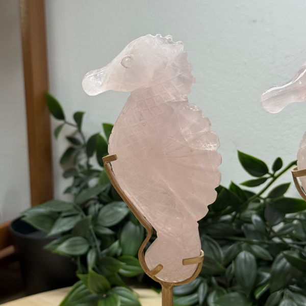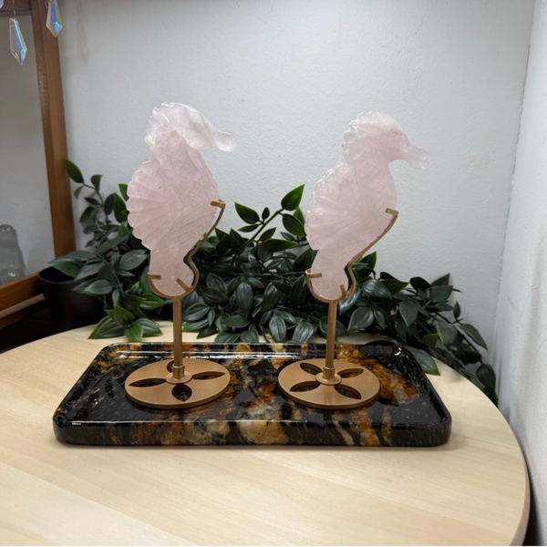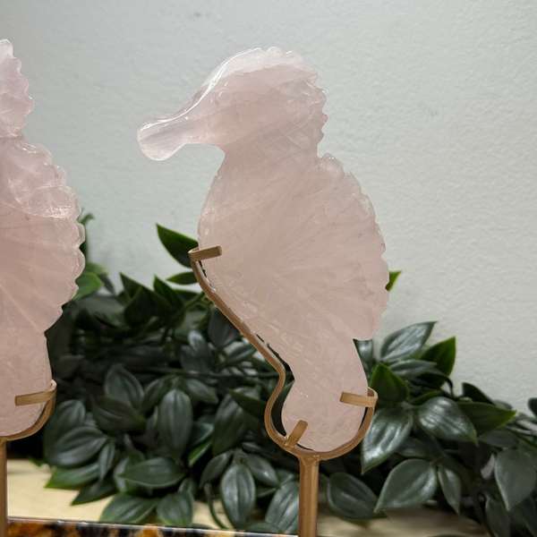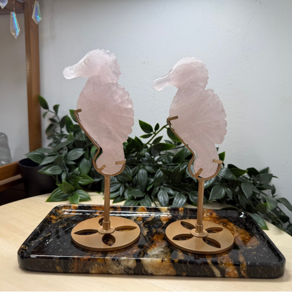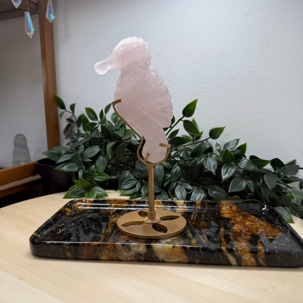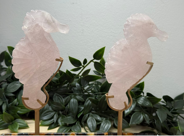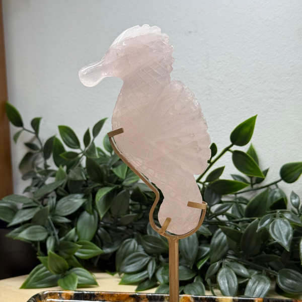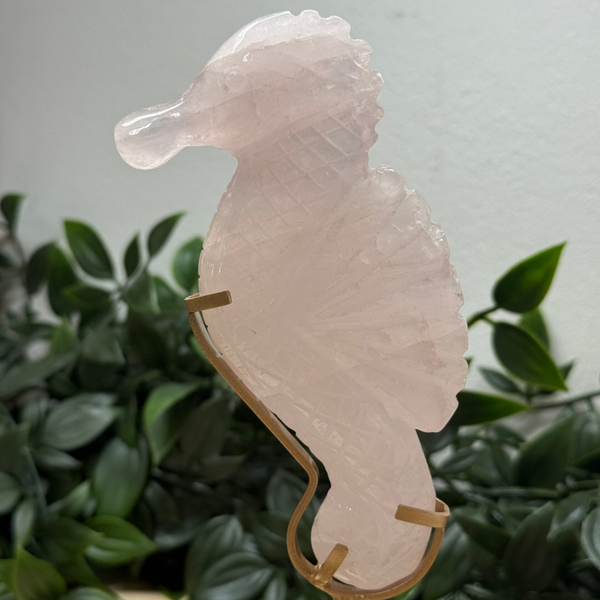 Groot zeepaard handgemaakt uit Rozenkwarts steen. Inclusief houder circa 25 cm hoog.