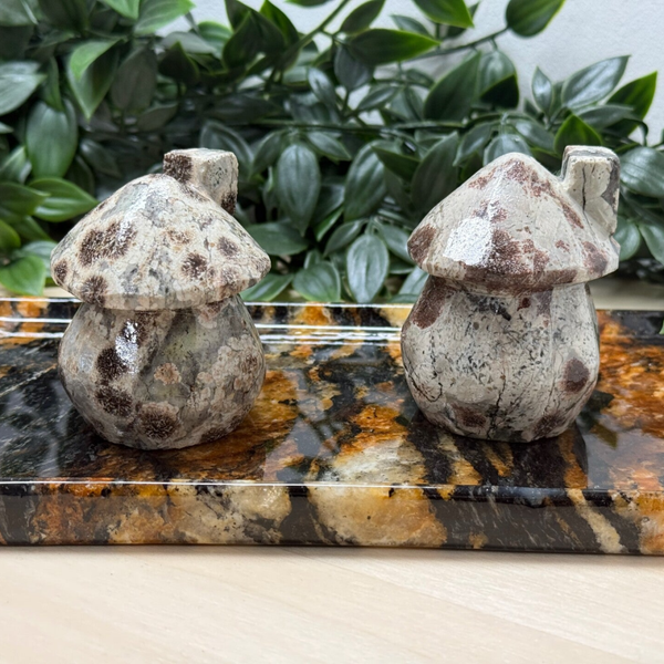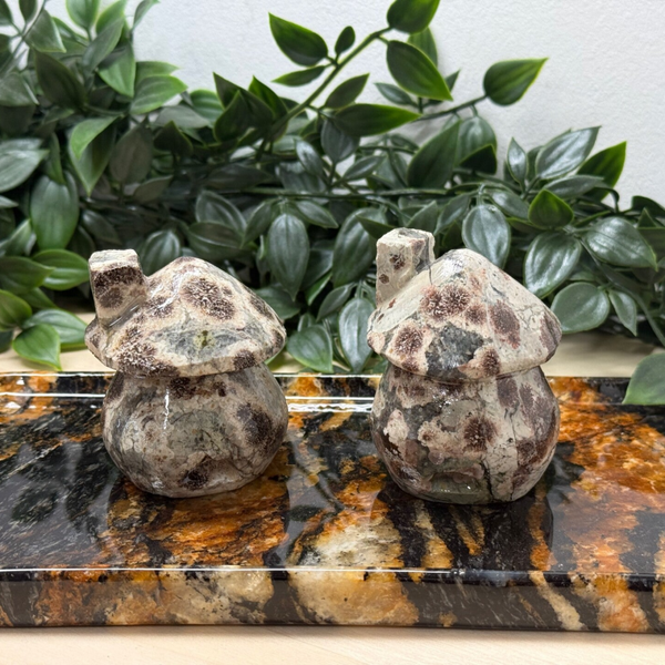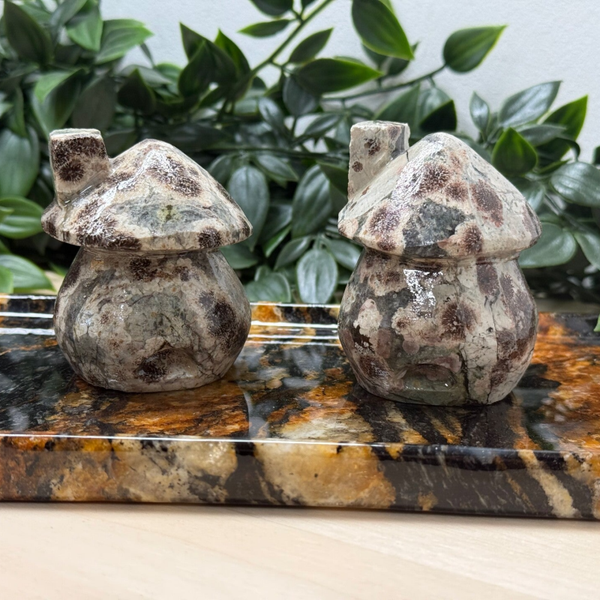 Leuk stukje deco. De paddenstoelen zijn voorzien van een laklaagje ter bescherming van de steen. Gemaakt van bloem rhyoliet en 7 cm hoog en gewicht van 250 gram per huisje. De prijs is voor één huisje. Bij aankoop wordt een willekeurig huisje geleverd te zien op de foto's.