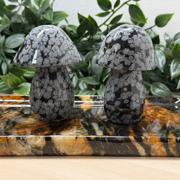 Paddenstoelen gemaakt van sneeuwvlok obsidiaan. De paddenstoelen wegen rond de 200 gram en zijn 9 cm in hoogte.