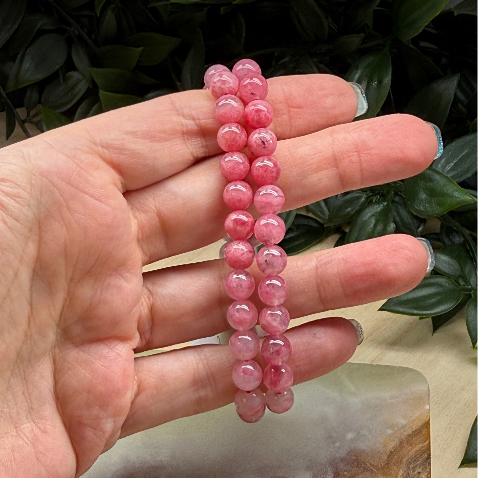 Rhodoniet is een roze tot roodbruine edelsteen die behoort tot de pyroxenoïden en vaak donkere zwarte aders of insluitsels van mangaanoxide vertoont, wat haar een opvallend en contrastrijk uiterlijk geeft. De naam komt van het Griekse rhodon, wat “roos” betekent, en verwijst naar de karakteristieke kleur. Belangrijke vindplaatsen liggen in Rusland (Oeral), Zweden, Australië en de Verenigde Staten, waar de steen zowel in sieraden als in decoratieve objecten wordt gebruikt. Al sinds de 18e eeuw wordt rhodoniet gewaardeerd om zijn schoonheid en symboliek; in de edelsteenkunde wordt hij vaak geassocieerd met emotionele balans, compassie en het versterken van vriendschappen. Tegenwoordig zie je rhodoniet veel terug in kralen, cabochons en handgeslepen stukken die verwerkt worden in kettingen, armbanden en meditatieobjecten.