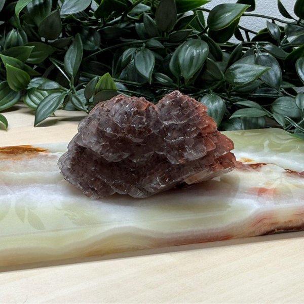 Leuk cluster van rode pagode calciet van 200 gram. Mooie glans.