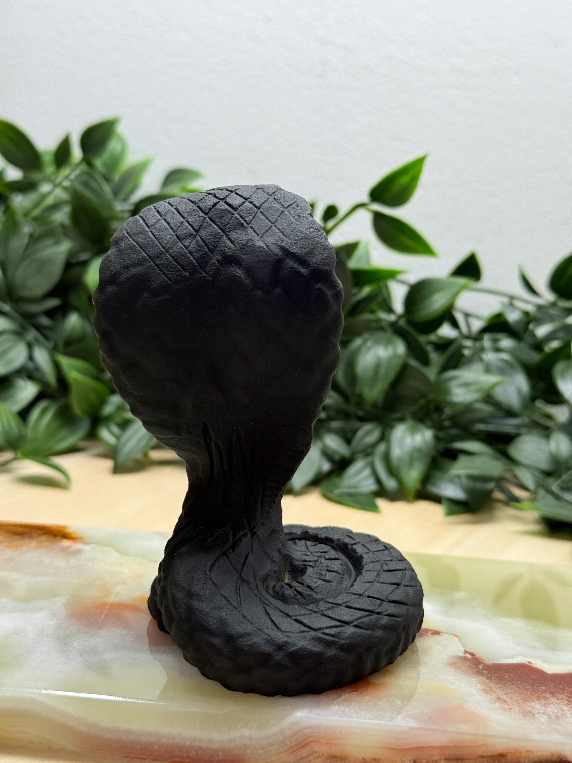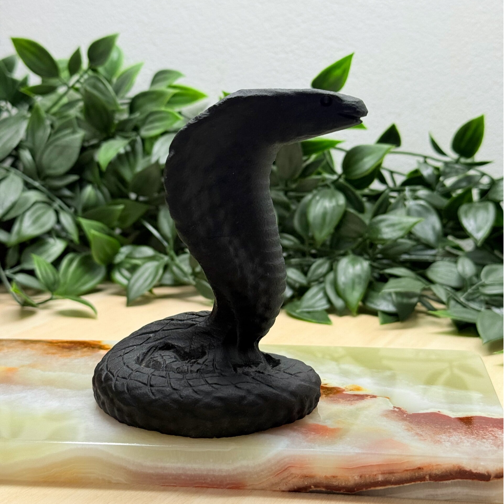 Slang / cobra van zwart obsidiaan. Het beeld is 10 cm hoog en weegt circa 250 gram.