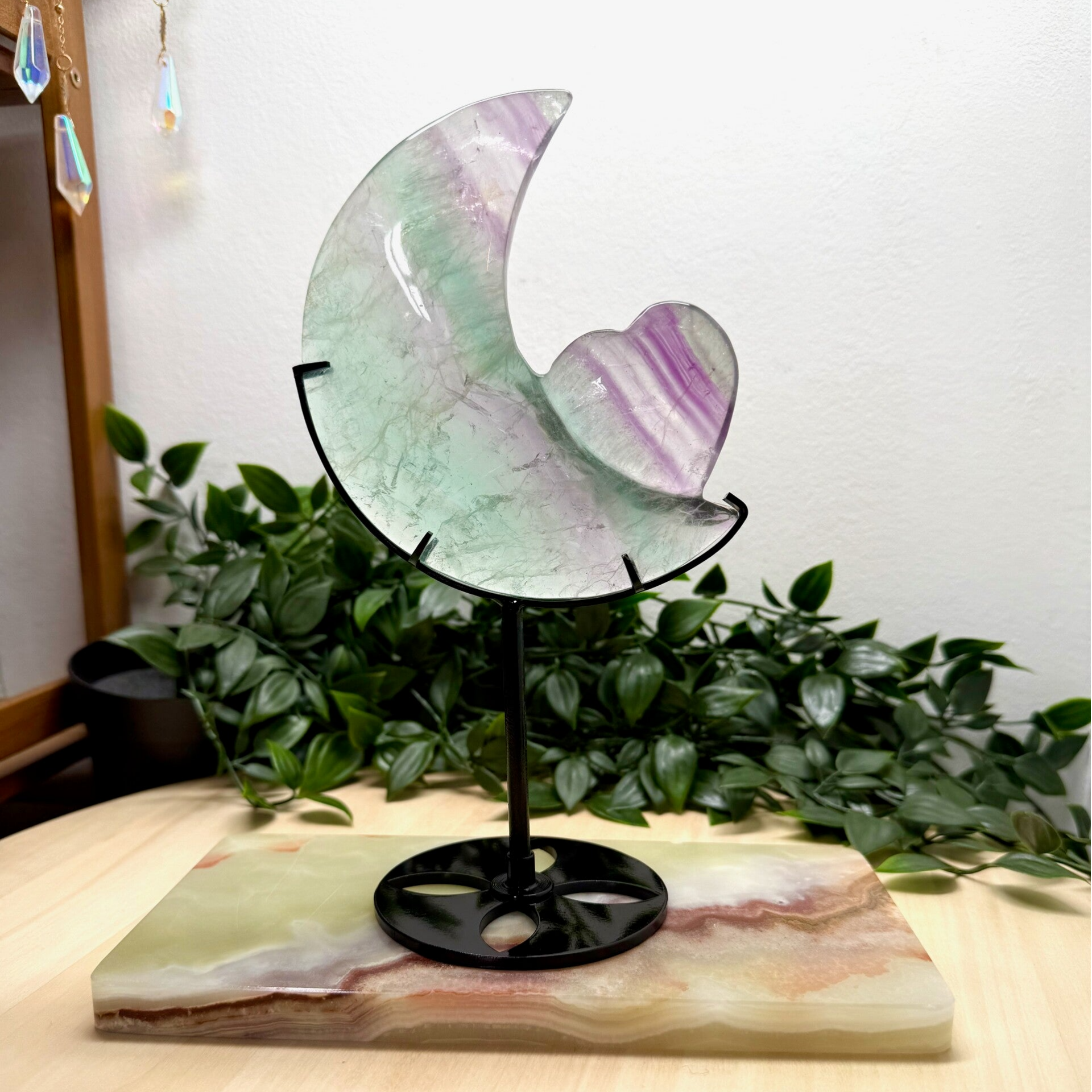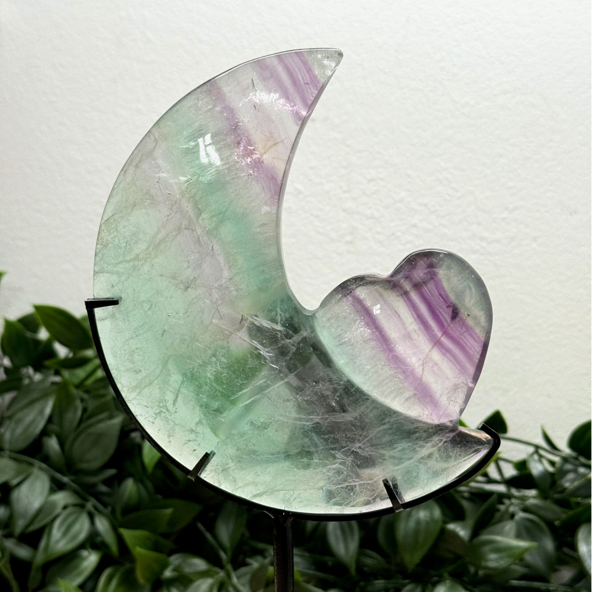 Dit bijzondere fluoriet stuk is zorgvuldig geslepen in de vorm van een maan met een hart en toont een zeldzame combinatie van groene tinten met rode kleuraccenten. Het groene fluoriet straalt rust, heling en balans uit, terwijl de rode schakeringen vitaliteit en passie toevoegen. Samen vormen ze een harmonieus geheel waarin de maan symbool staat voor intuïtie en het hart voor liefde en emotionele kracht. Door de unieke kleurcombinatie en de betekenisvolle vorm is dit fluorietstuk niet alleen een visueel opvallend verzamelobject, maar ook een krachtig hulpmiddel voor meditatie en persoonlijke groei.