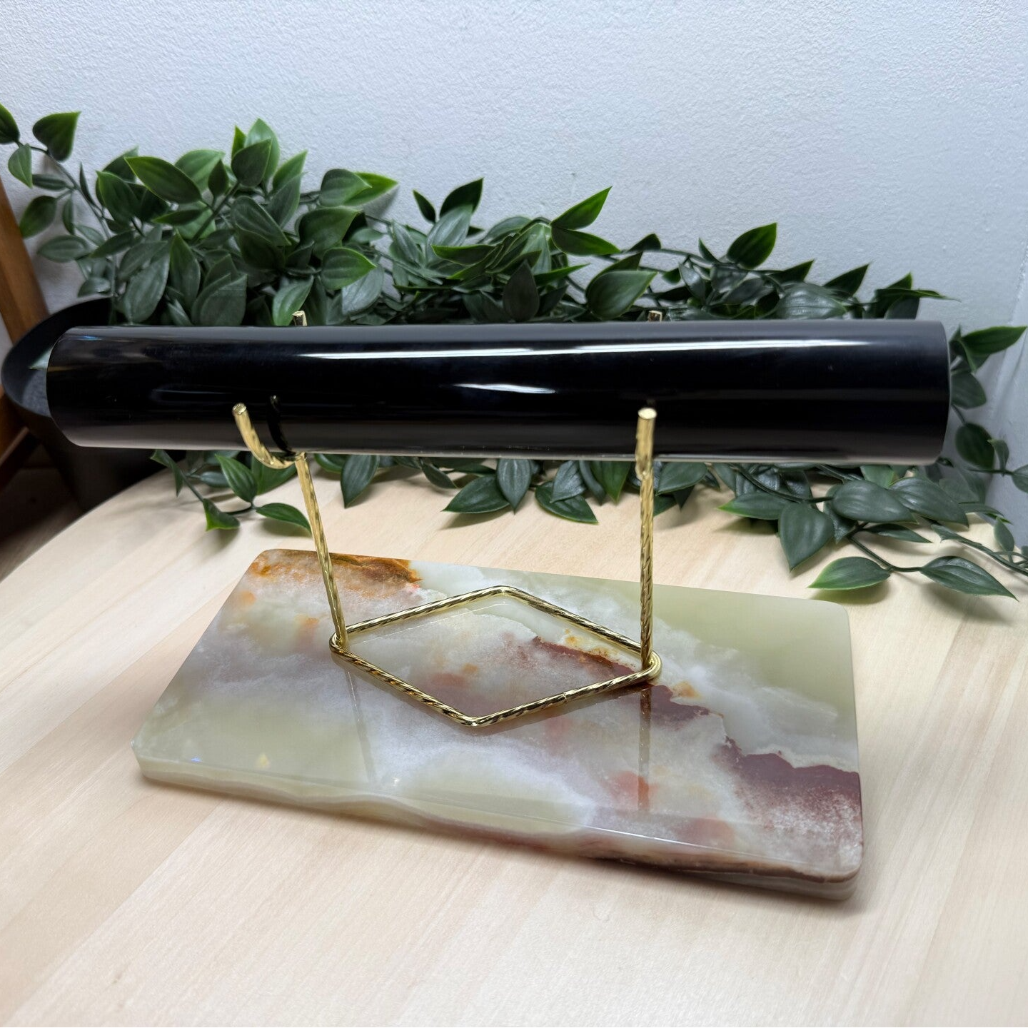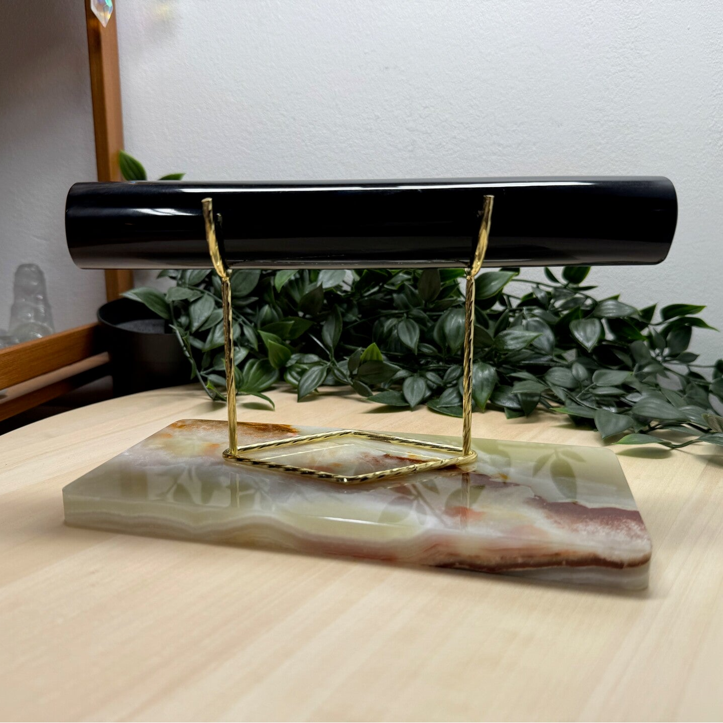 Een sieradenhouder van handgesneden zwart obsidiaan. De cilinder van obsidiaan is circa 23 cm in lengte en 11 cm in hoogte, wordt geleverd inclusief de houder. Deze elegante houder is vervaardigd uit natuurlijk zwart obsidiaan, een vulkanisch glas dat bekendstaat om zijn diepe glans en krachtige uitstraling. Het glad gepolijste oppervlak geeft een luxe en moderne look, terwijl de steen traditioneel wordt gewaardeerd om zijn beschermende en aardende eigenschappen. Perfect als stijlvolle sierhouder voor kleine objecten, sieraden of als decoratief accent in huis, combineert dit stuk functionaliteit met de mystieke schoonheid van obsidiaan.
