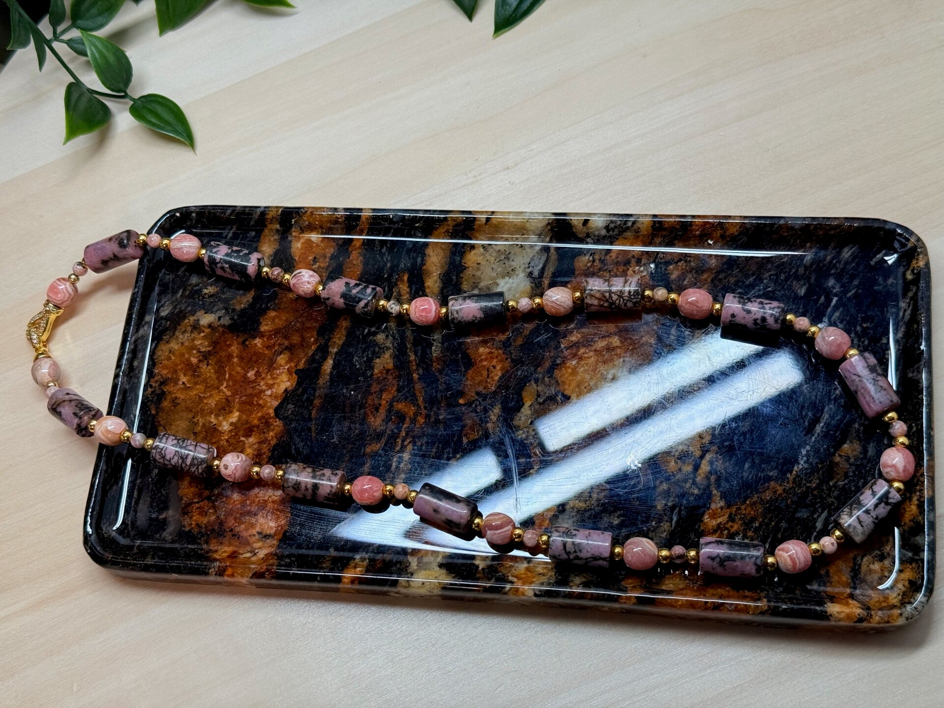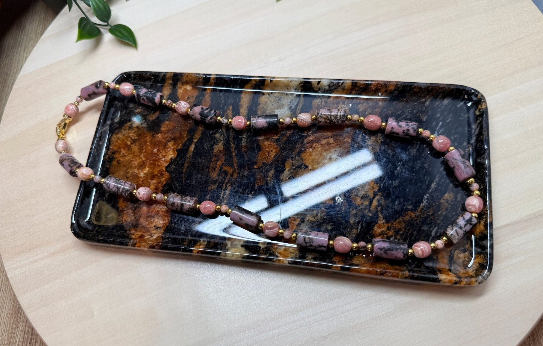 Deze schitterende handgemaakte ketting combineert de warme, aardse schoonheid van rhodoniet met de zachte roze tinten van rhodocrosiet. De ketting bestaat uit elegante rhodoniet-tubes van 17 × 10 mm, die harmonieus worden afgewisseld met 8 × 8 mm rhodocrosietkralen, subtiel onderbroken door fijne 4 mm kralen en goudkleurige spacers voor een luxueuze glans. Het geheel wordt stijlvol afgesloten met een goudkleurige sluiting, verrijkt met sprankelende strass die een vleugje glamour toevoegt. Rhodoniet, bekend om zijn roze tot roodbruine kleur met donkere aders, vindt zijn oorsprong in onder andere Rusland en Madagaskar en wordt vaak gewaardeerd als steen van balans en kracht. Rhodocrosiet, met zijn kenmerkende framboosroze tinten en witte banden, komt voornamelijk uit Argentinië en de Verenigde Staten en staat symbool voor liefde en harmonie. Samen vormen deze edelstenen een betoverende ketting die niet alleen een sieraad is, maar ook een verhaal van natuurlijke herkomst en verfijnde elegantie vertelt.