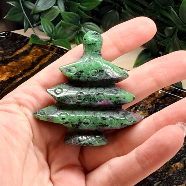 Beeldje van een kerstboom van circa 6 cm hoog. Gemaakt van robijn in zoisiet.