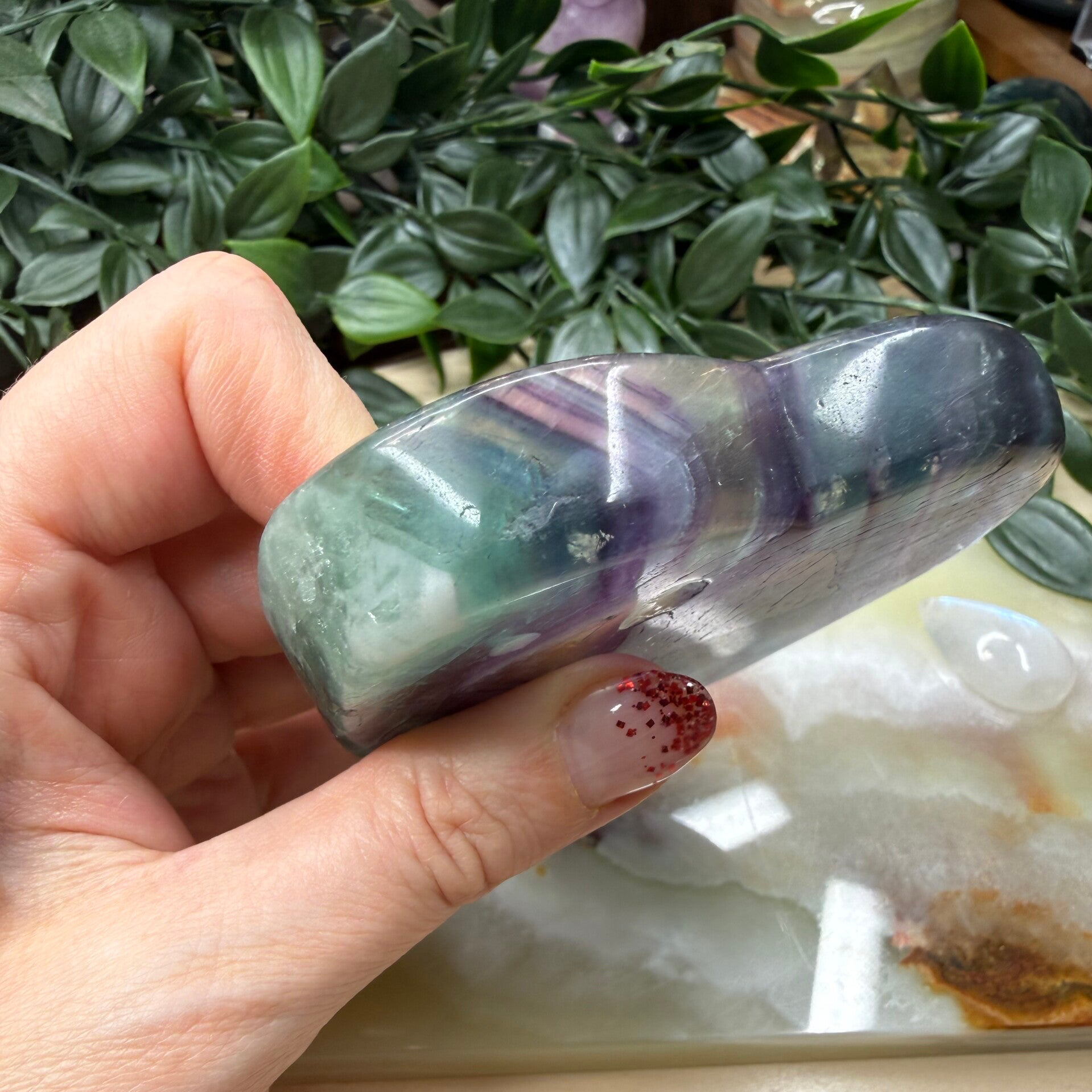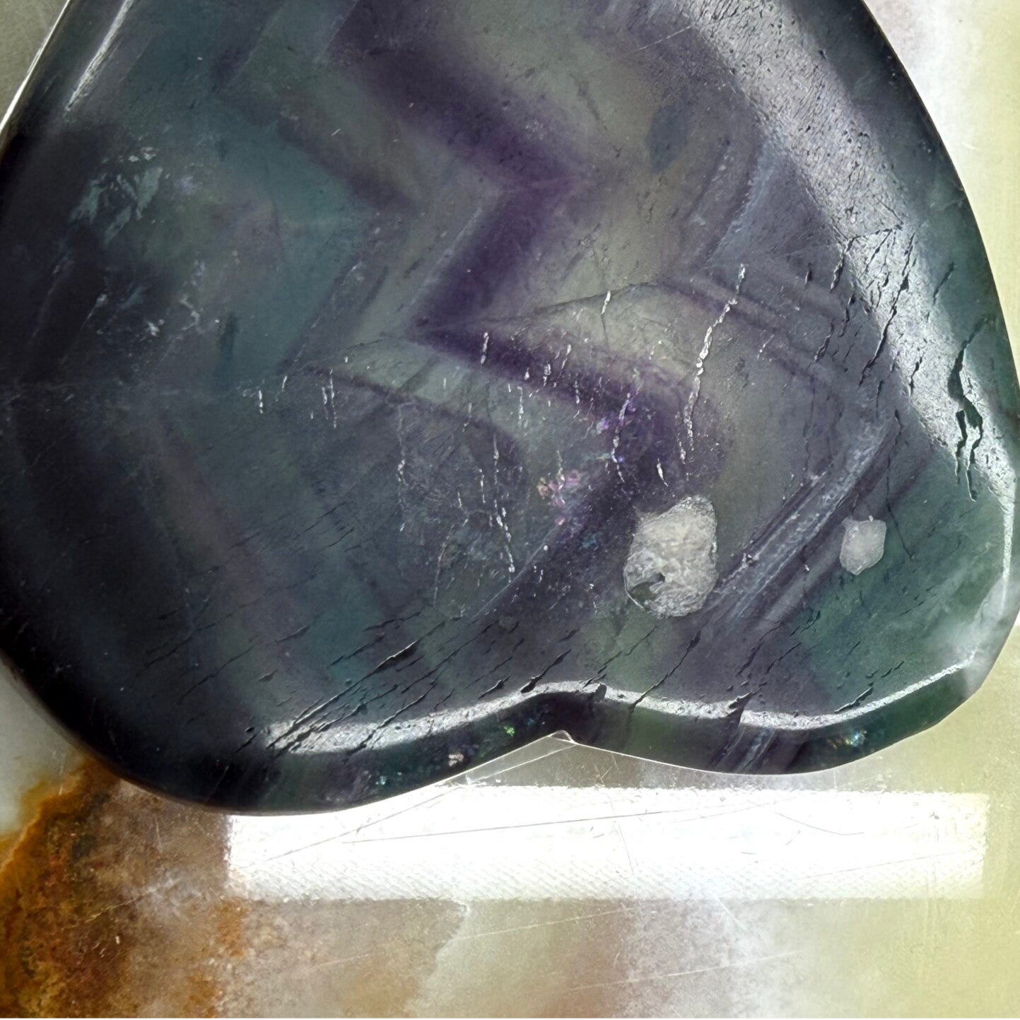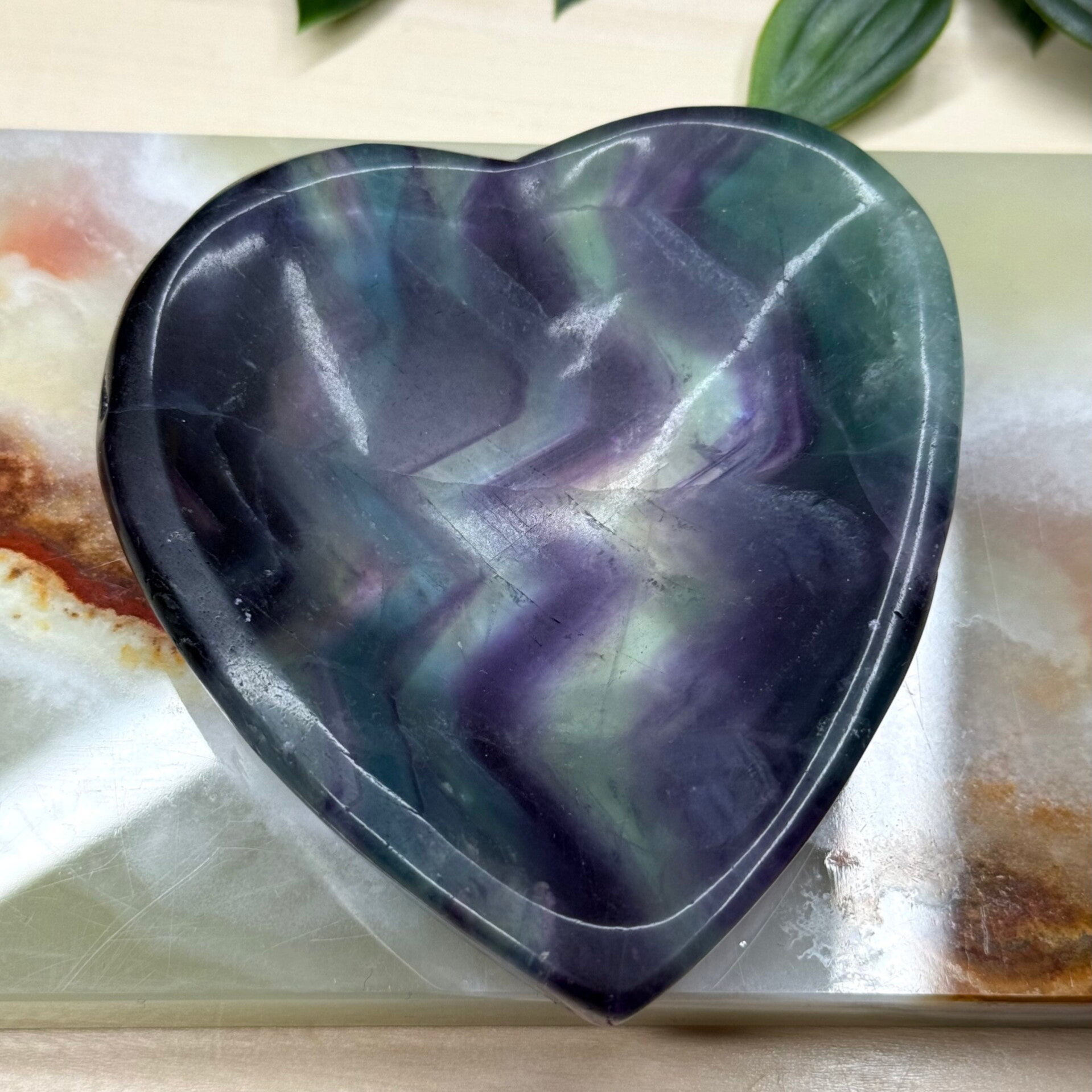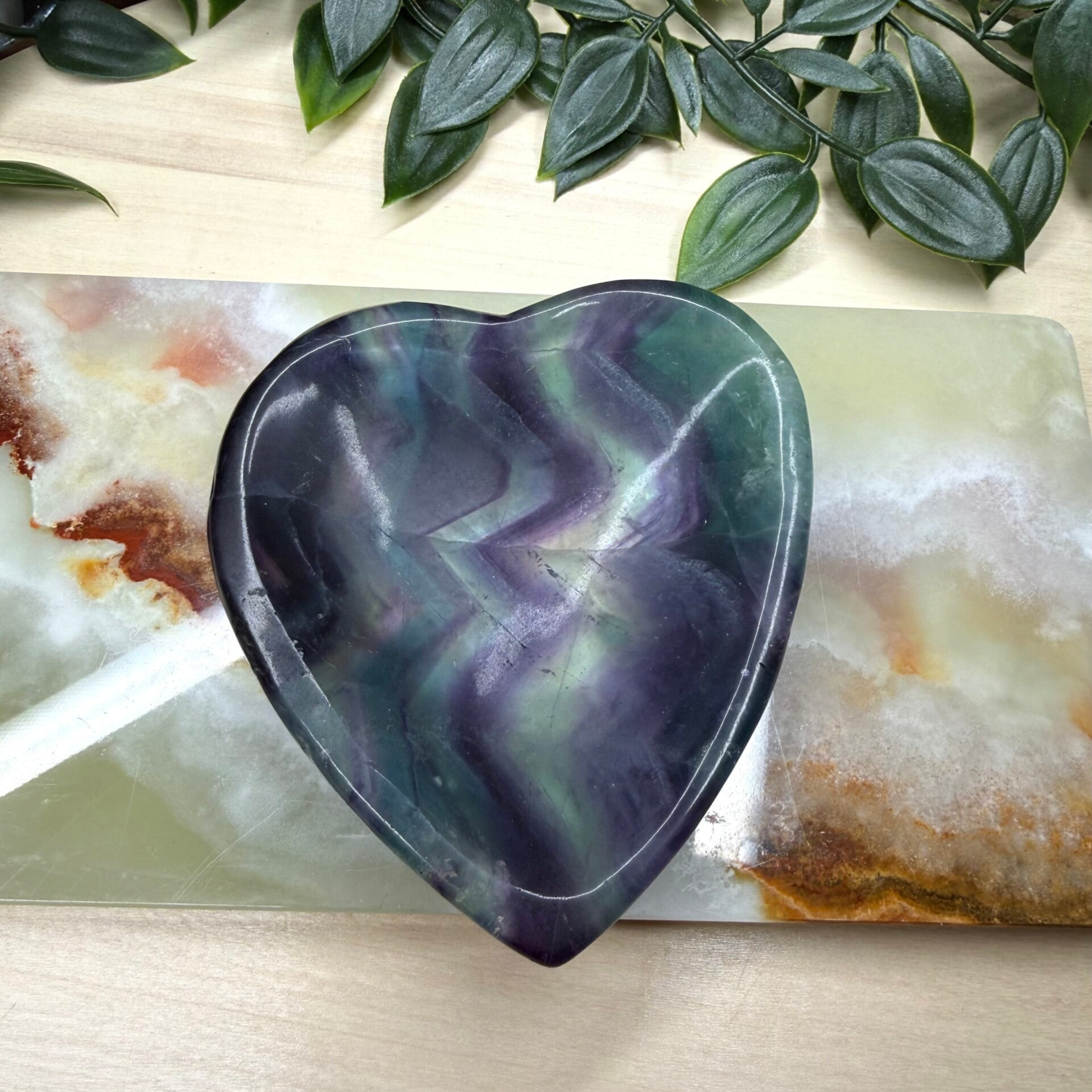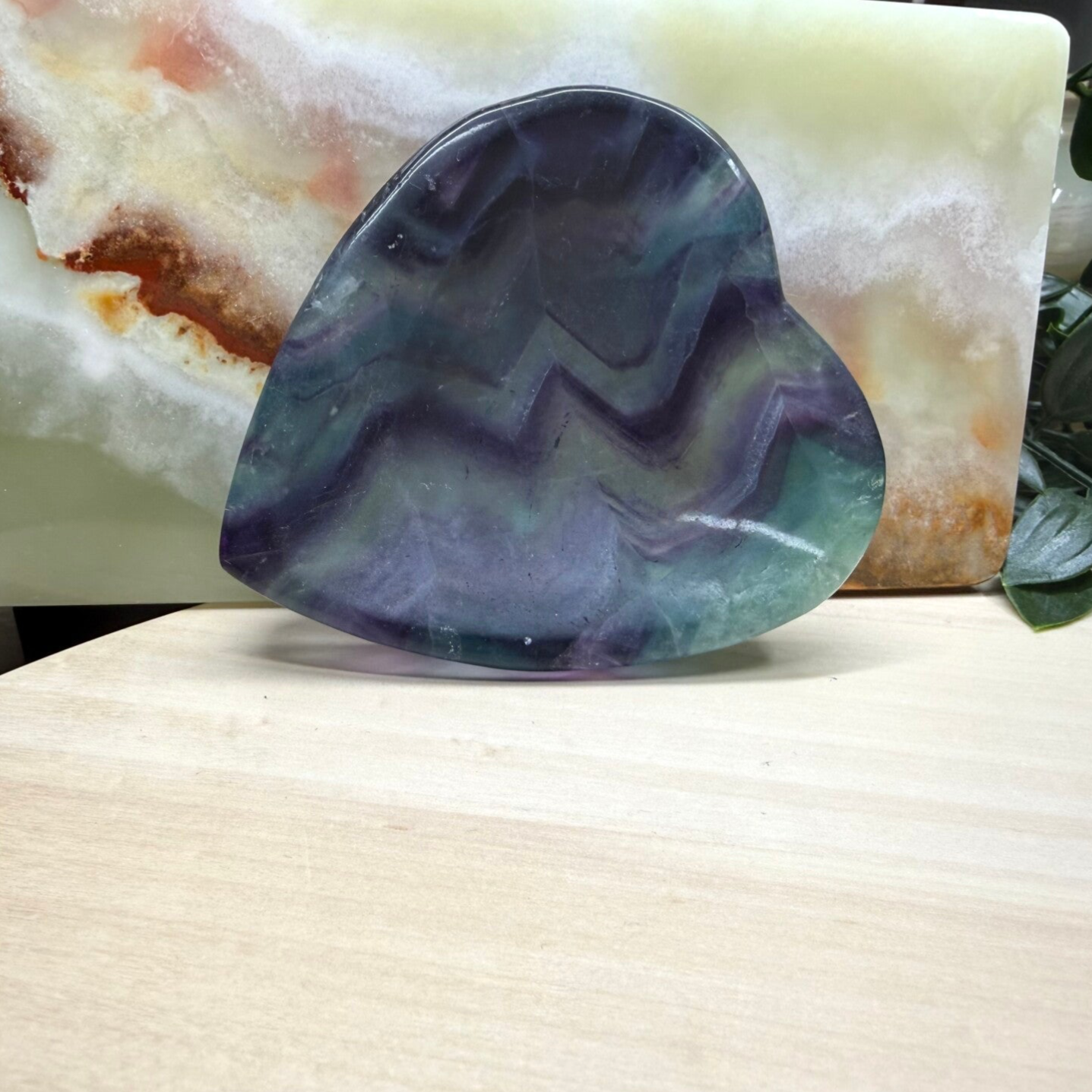 Mooie schaaltje van fluoriet in hartvorm van 10 bij 9 cm. Prachtige kleuren en strepen. Er zitten wat onregelmatigheden op bepaalde delen, ze lijken natuurlijk. Op de foto’s is dit te zien. Om deze reden heb ik de prijs verlaagd.