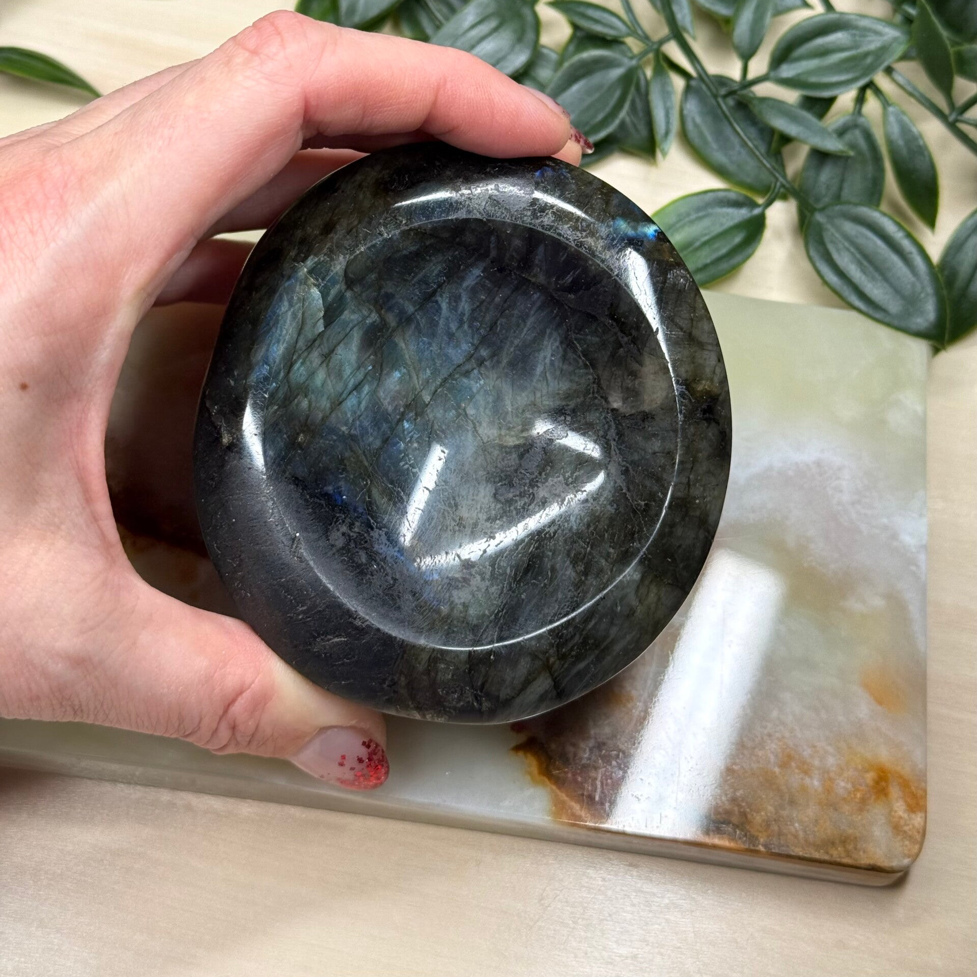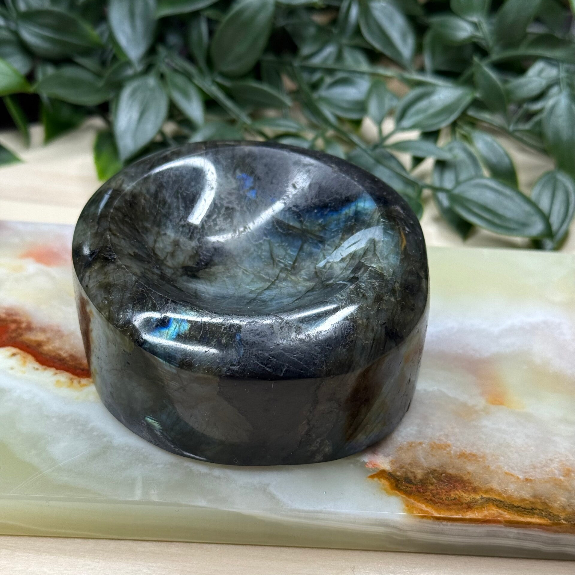 Bakje van Labradoriet van bijna 700 gram. Afmetingen zijn 8.5 bij 8 cm.