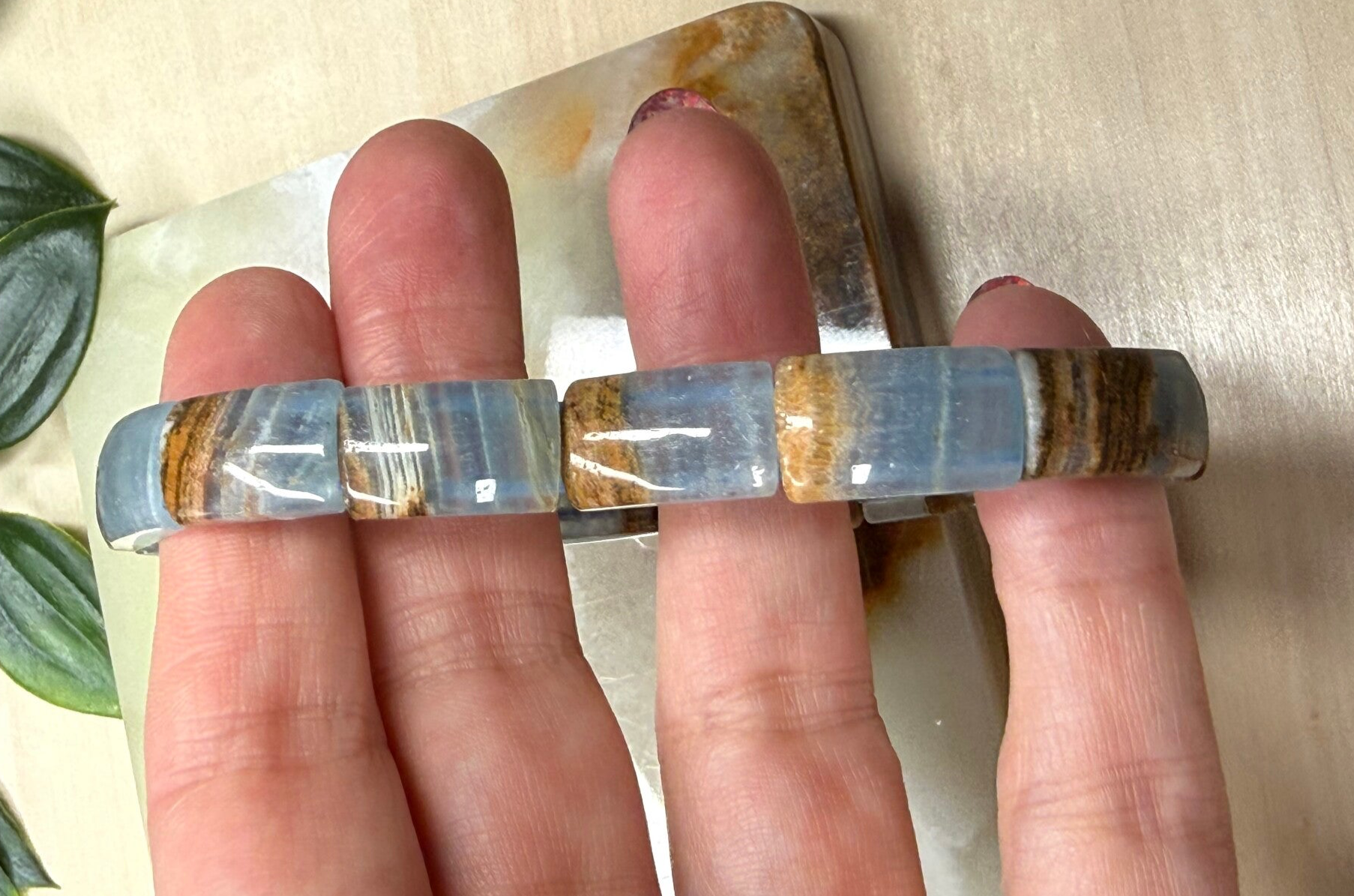 Blauwe onyx is een variëteit van chalcedoon die wordt gekenmerkt door diepblauwe tot blauwgroene tinten met natuurlijke banden of lagen die ontstaan door de afzetting van mineralen zoals silica, calciet en ijzeroxiden gedurende miljoenen jaren. De steen komt voor in landen als Brazilië, India, Uruguay en de Verenigde Staten en wordt gewaardeerd om zijn rustgevende uitstraling en decoratieve schoonheid. Door zijn combinatie van kleur, structuur en hardheid (6,5–7 op de schaal van Mohs) is blauwe onyx populair in sieraden, interieurstukken en spirituele toepassingen, waar hij vaak wordt geassocieerd met kalmte, helderheid en bescherming.