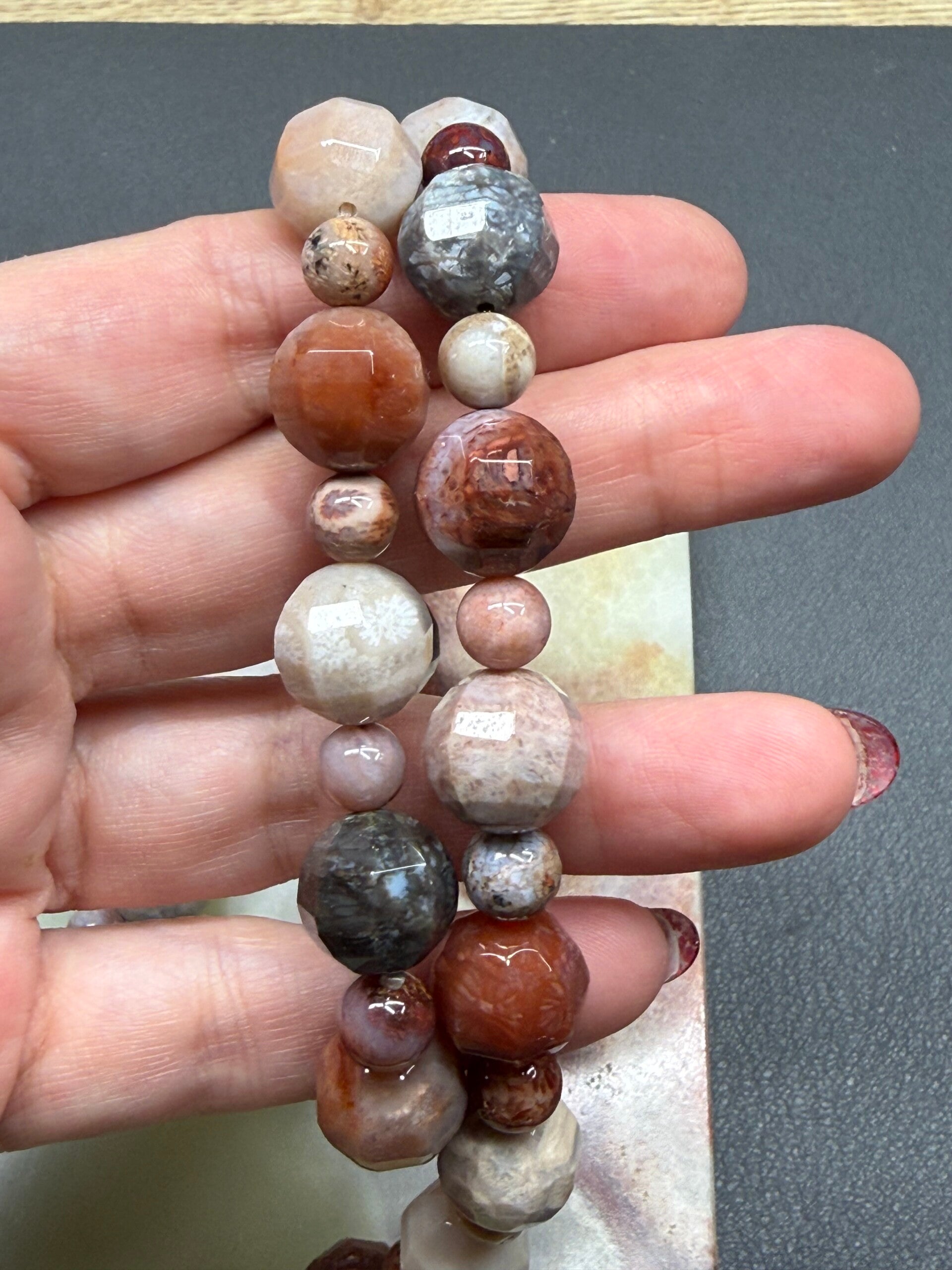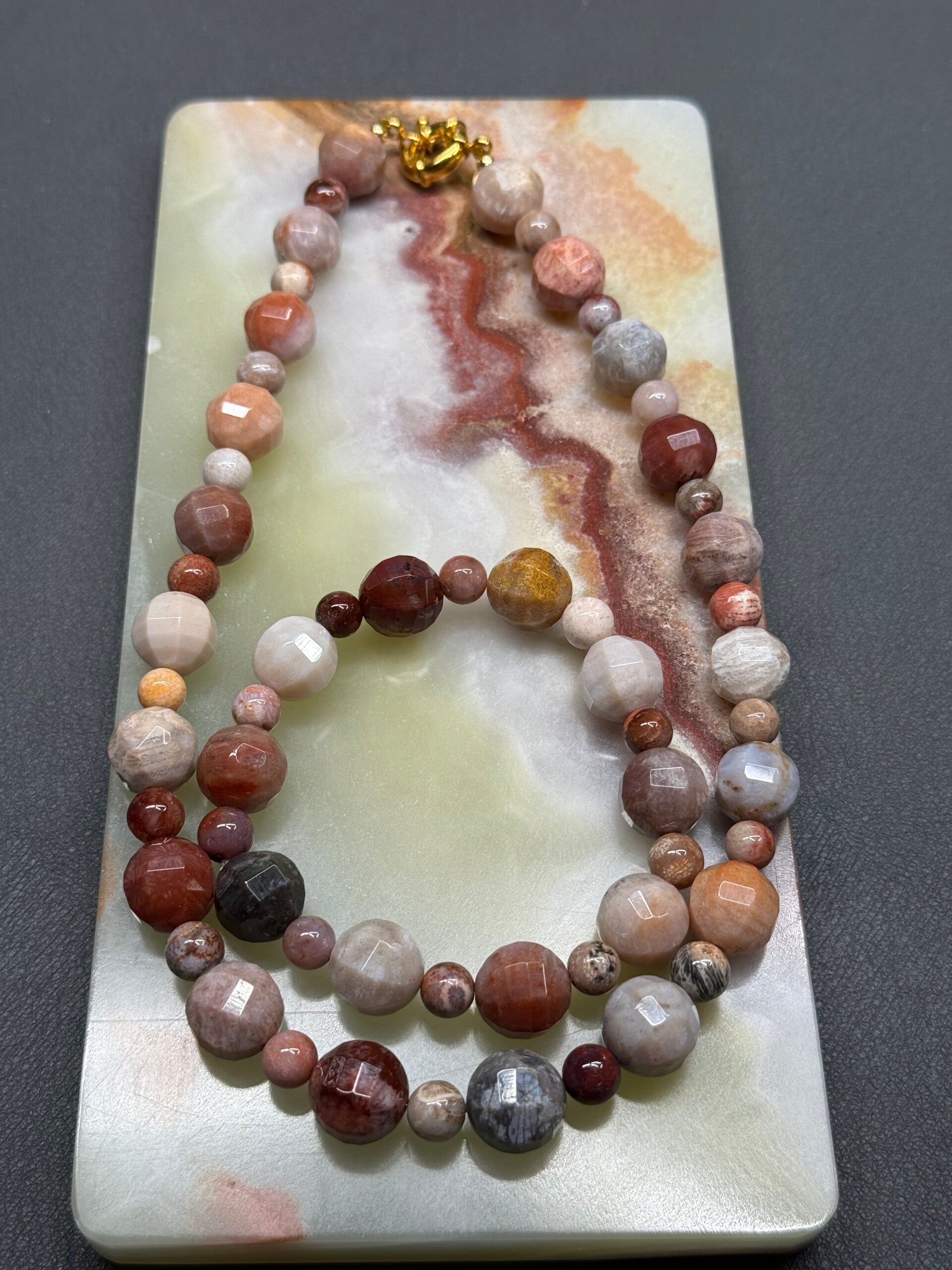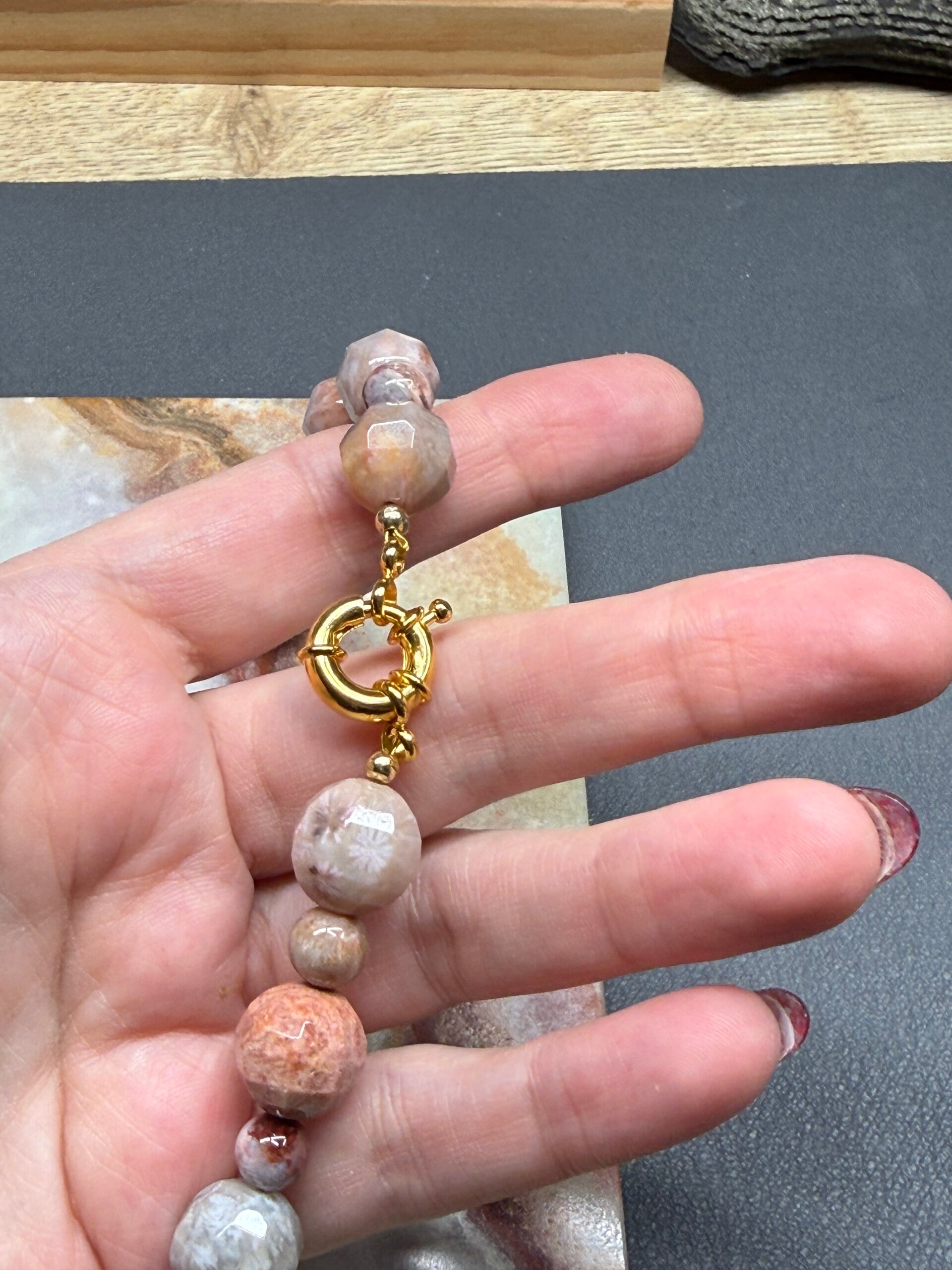 Set fossiel koraal bestaande uit een korte, niet verstelbare ketting van 42 cm in lengte en een armband met elastisch koord.