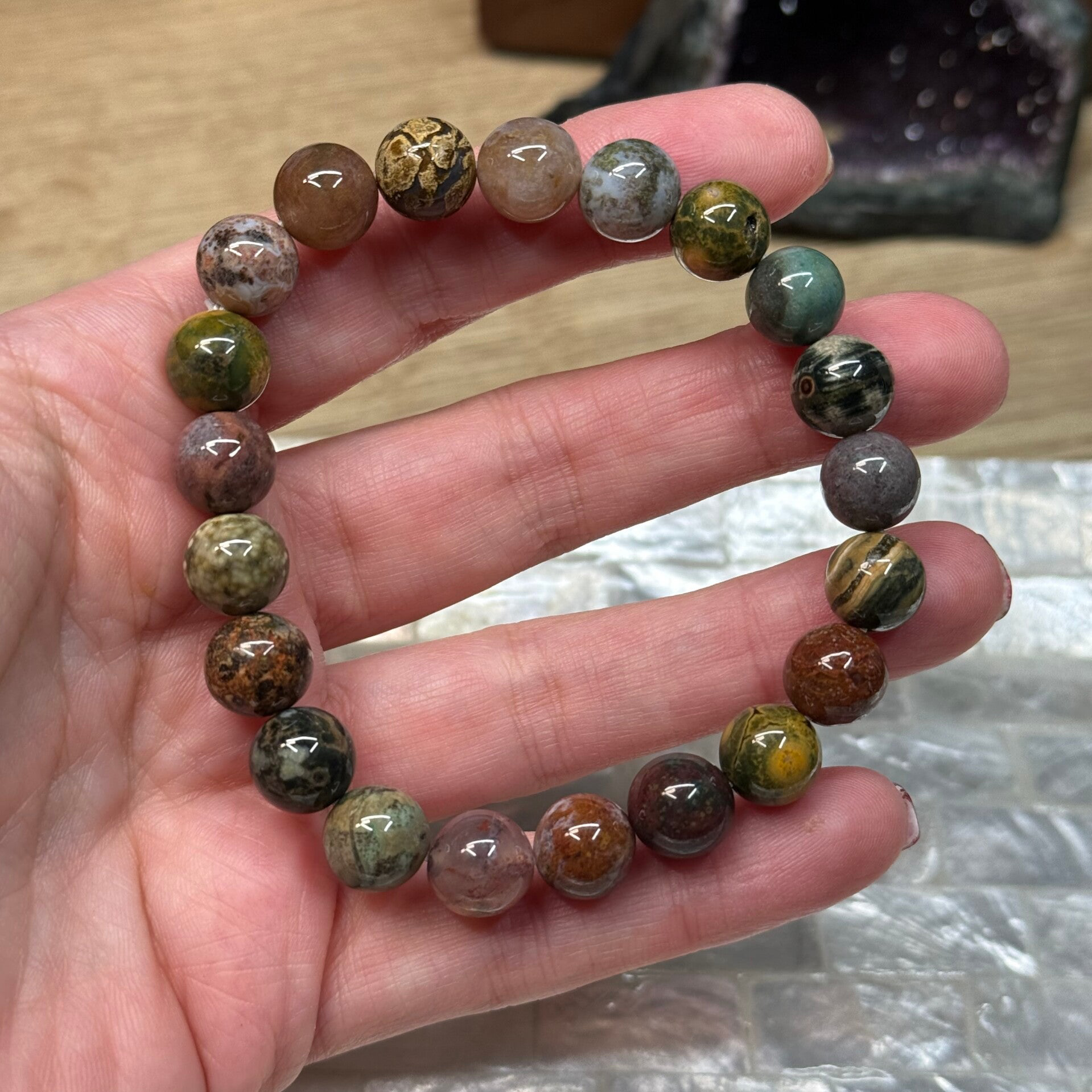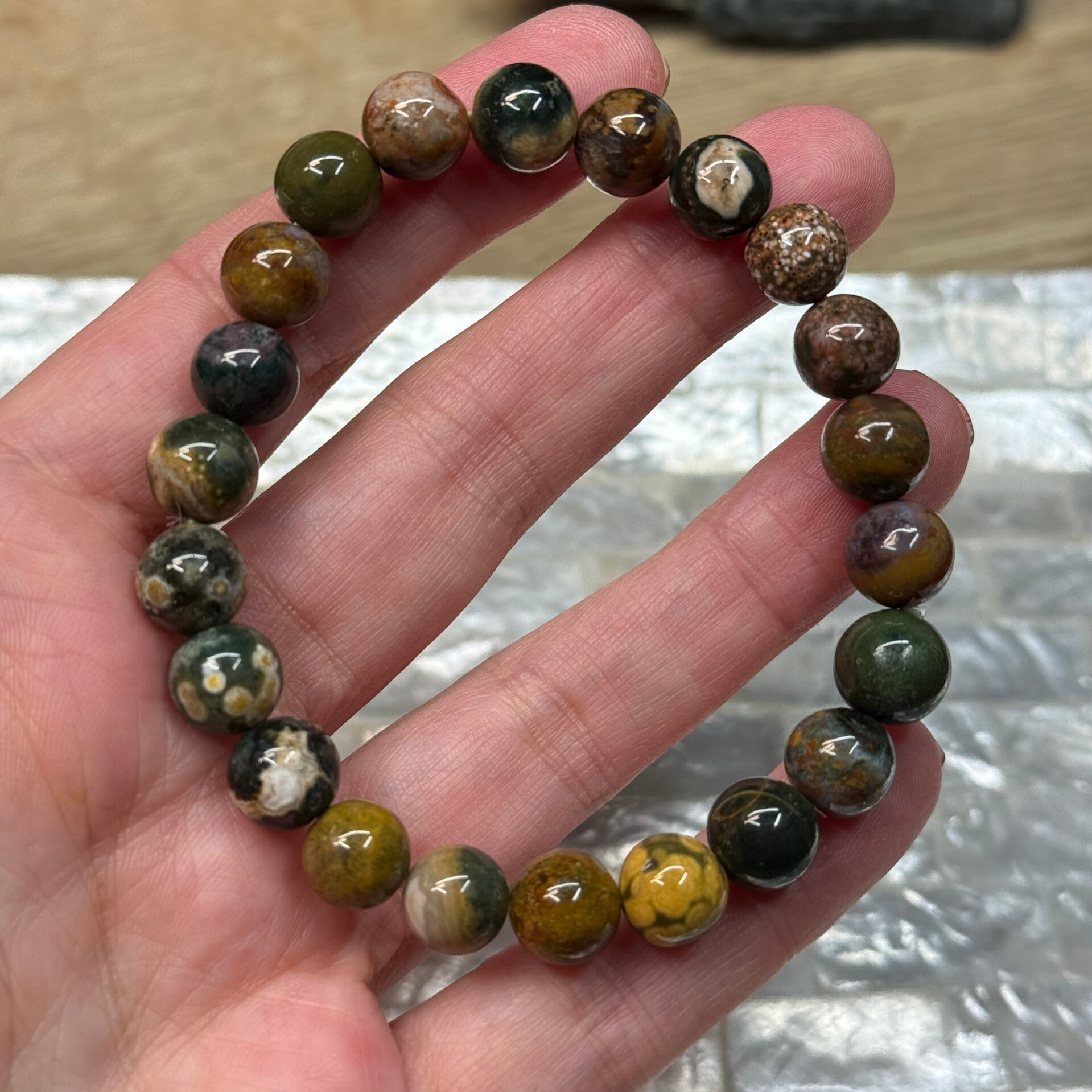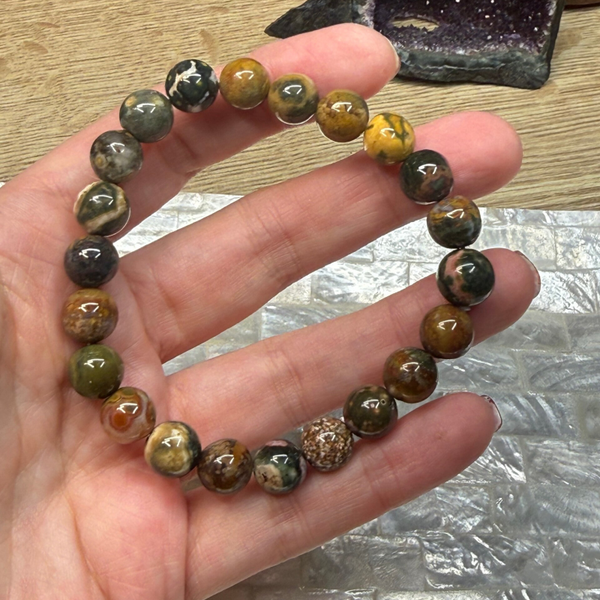 Armband van oceaan jaspis met grootte van 10 mm.