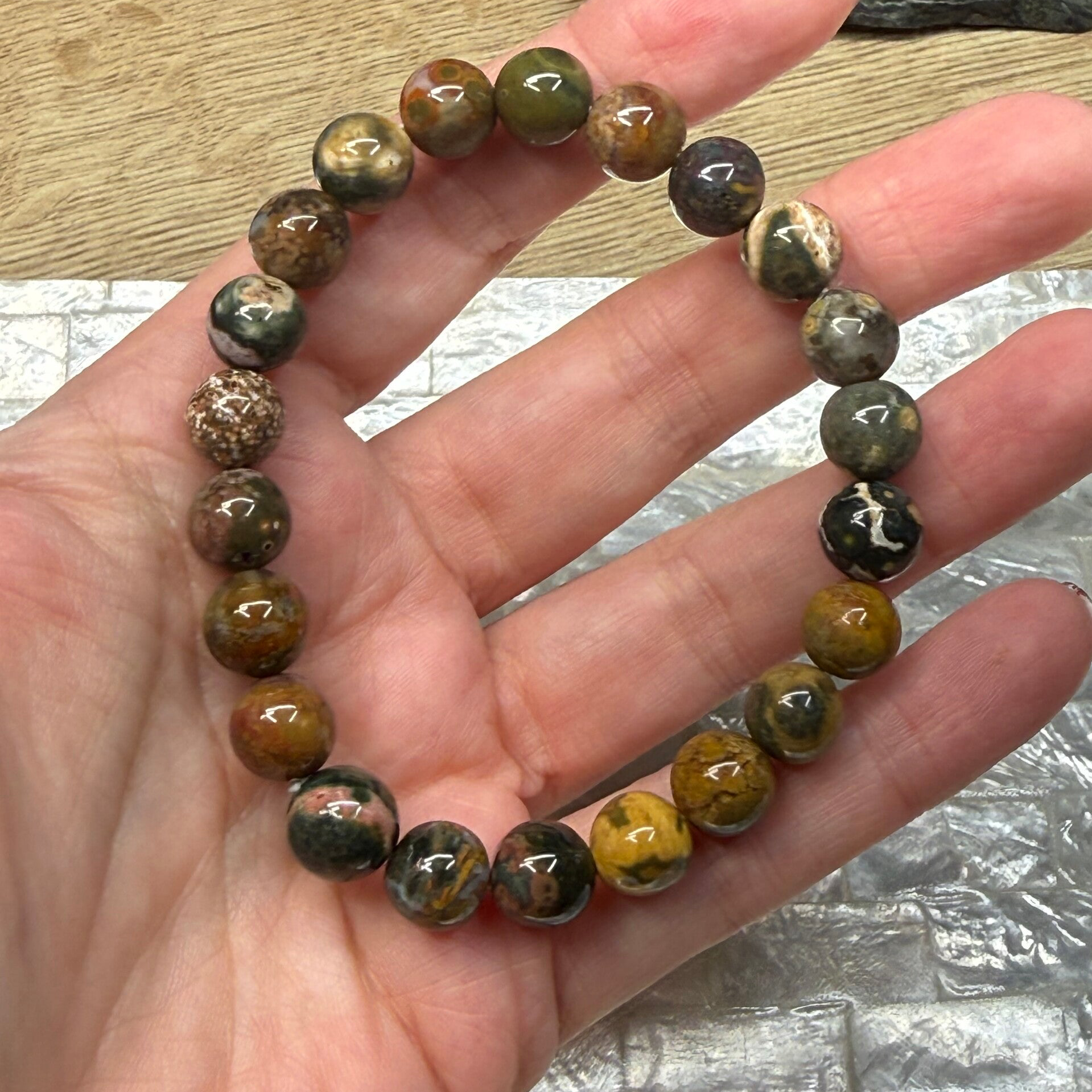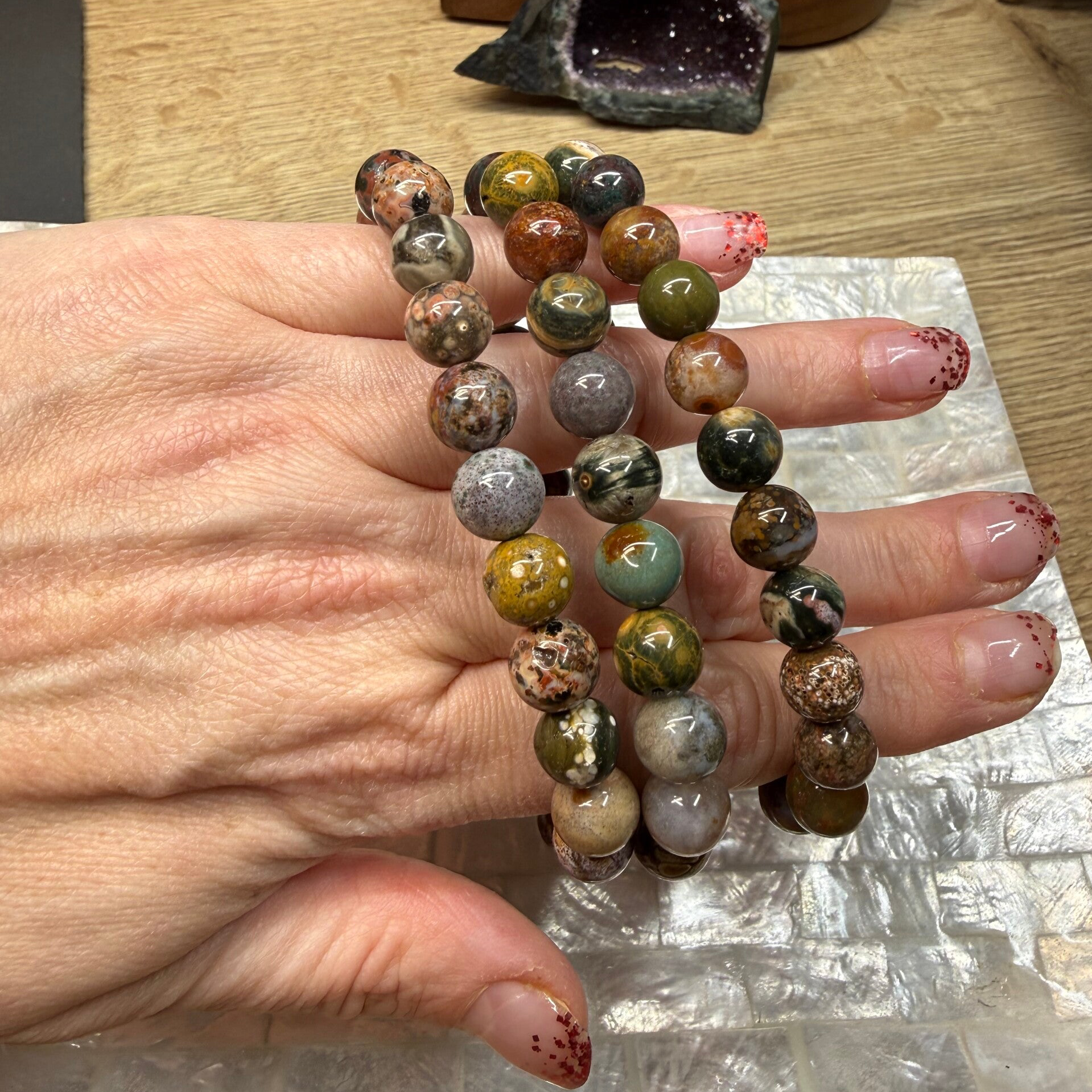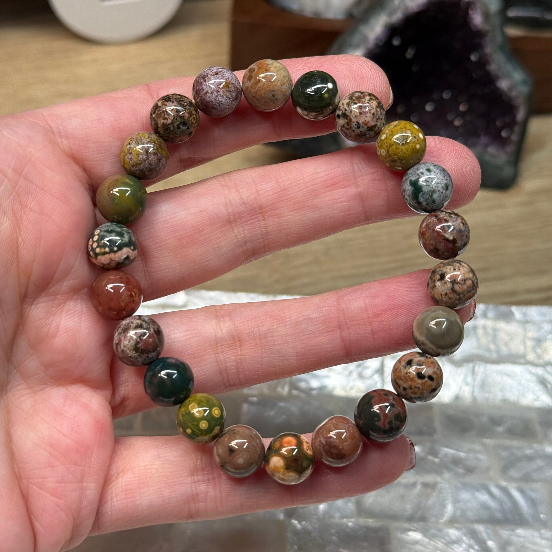Armband van oceaan jaspis met grootte van 10 mm.