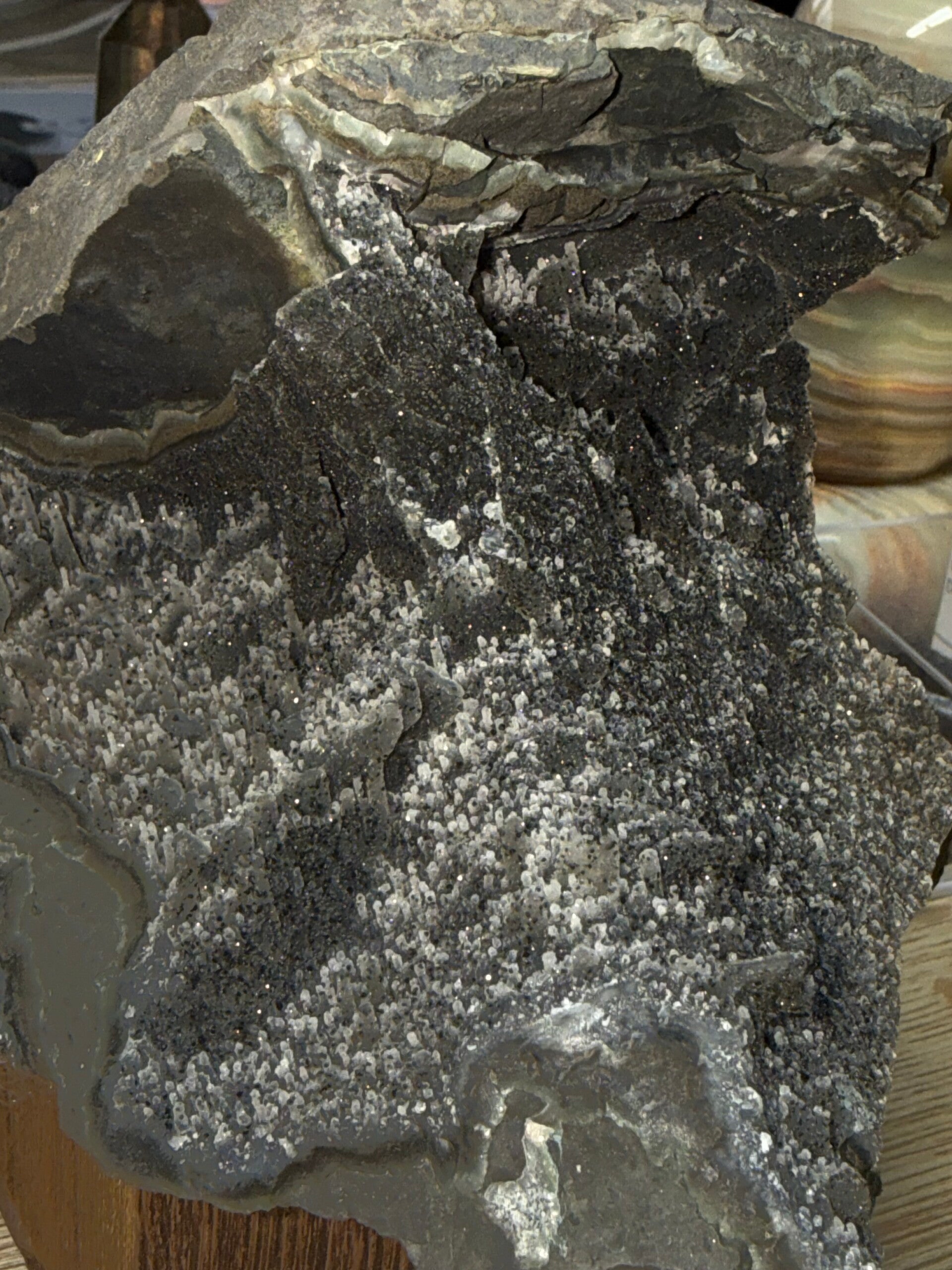 Mooi ruw stuk van zwarte chalcedoon uit India. Mooie schitteringen in het licht en gevormde stalagmieten. Kan staan op zichzelf op zowel het boven- als ondervlak. en heeft afmetingen 16 cm in de lengte en 11.5 cm in de hoogte. Weegt tegen de 750 gram.