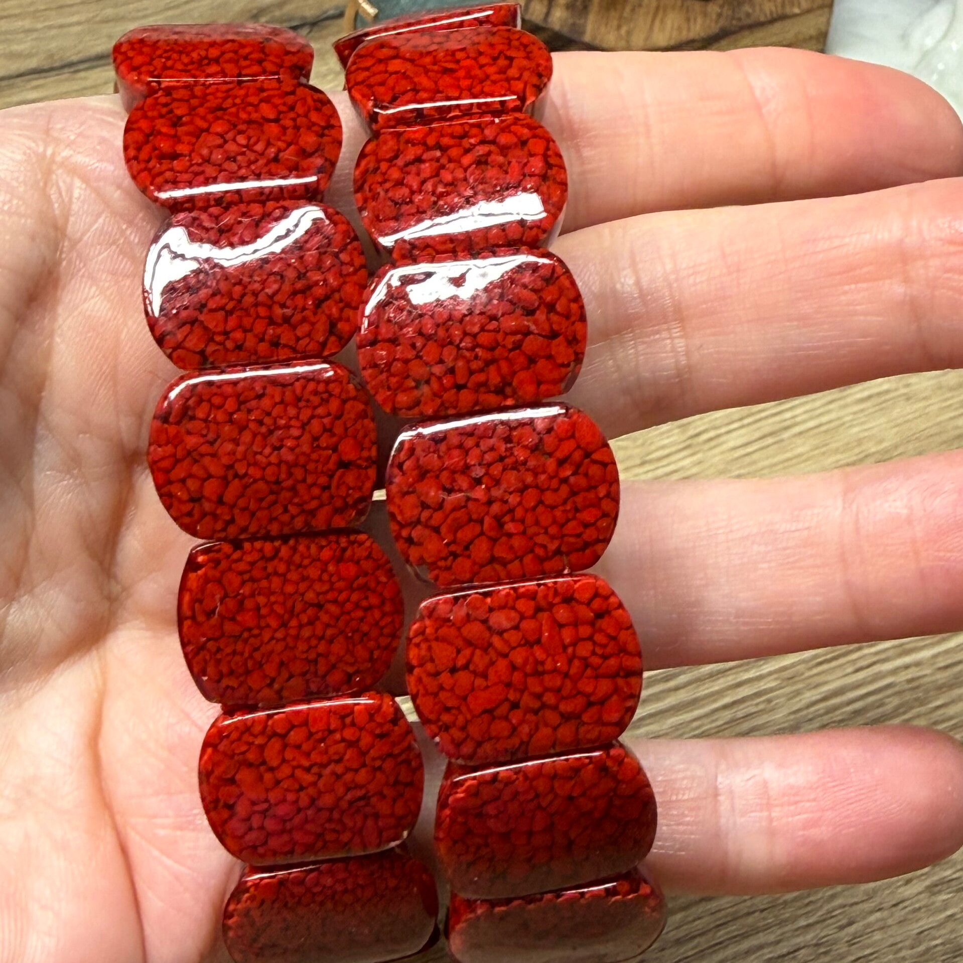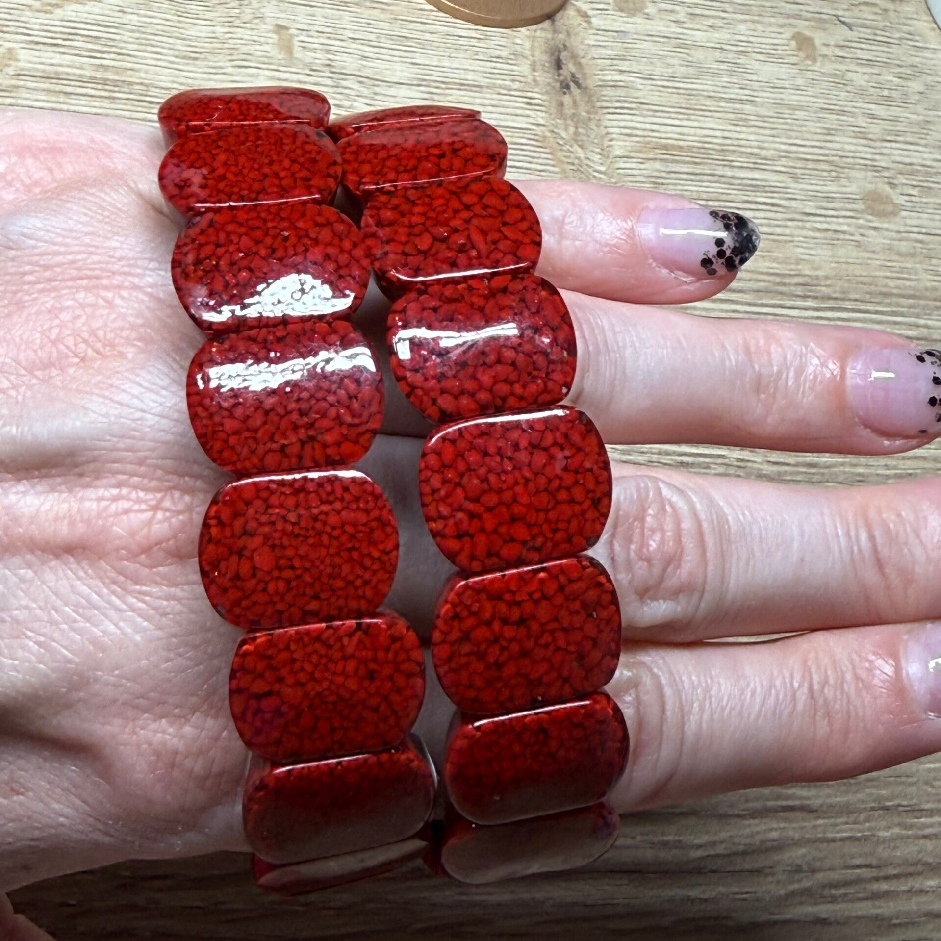 Vermiljoen soft bangle met stukjes cinnaber met resin eromheen.