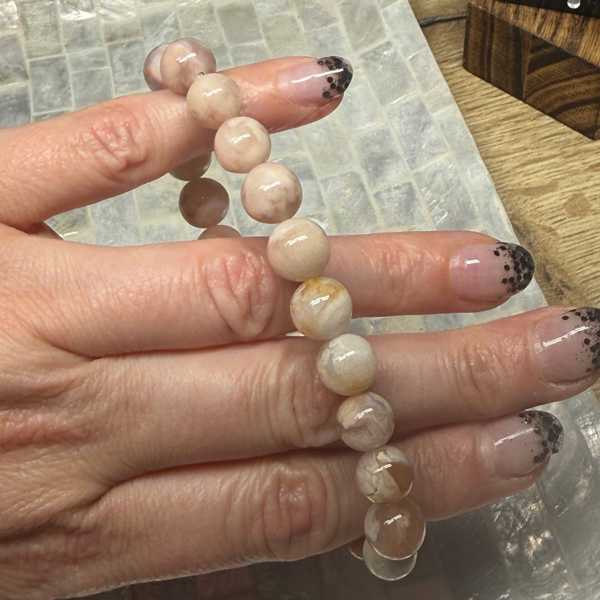 Bloemagaat is een relatief nieuwe agaatvariëteit uit Madagaskar, gevormd in vulkanische holtes uit silica, herkenbaar aan zijn roze‑perzik tinten en bloemachtige chalcedoon‑insluitsels.