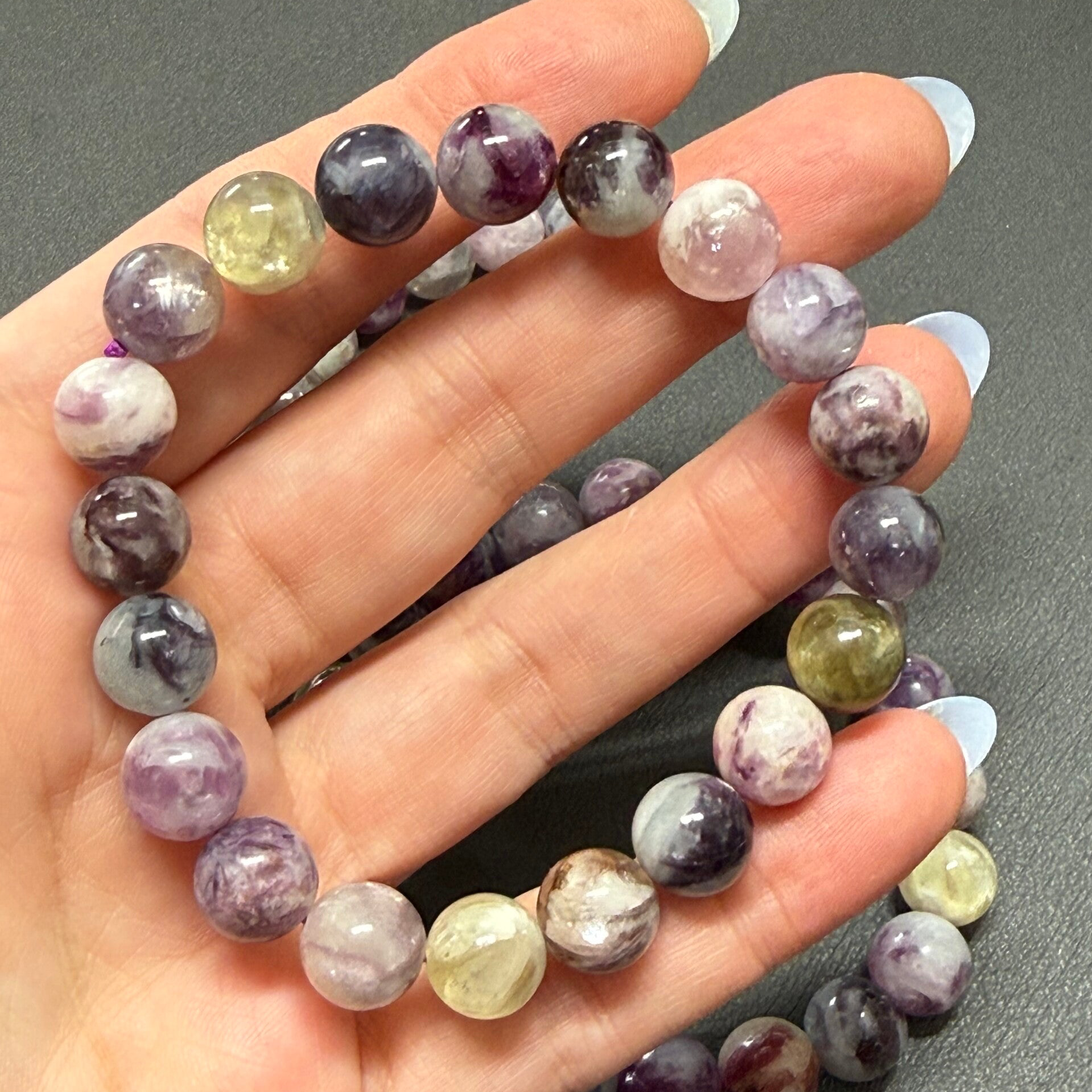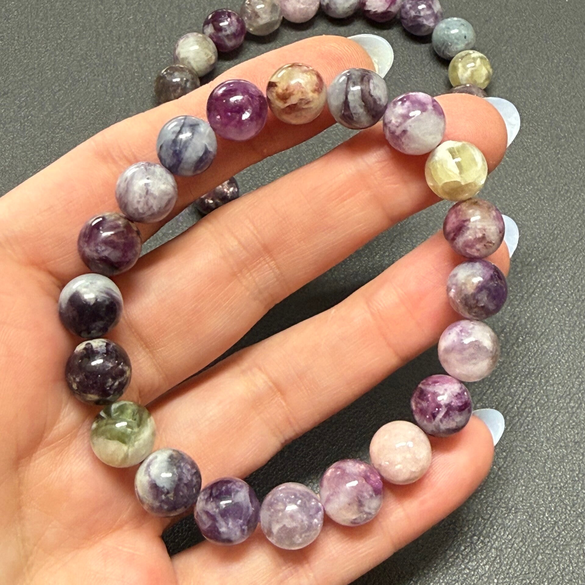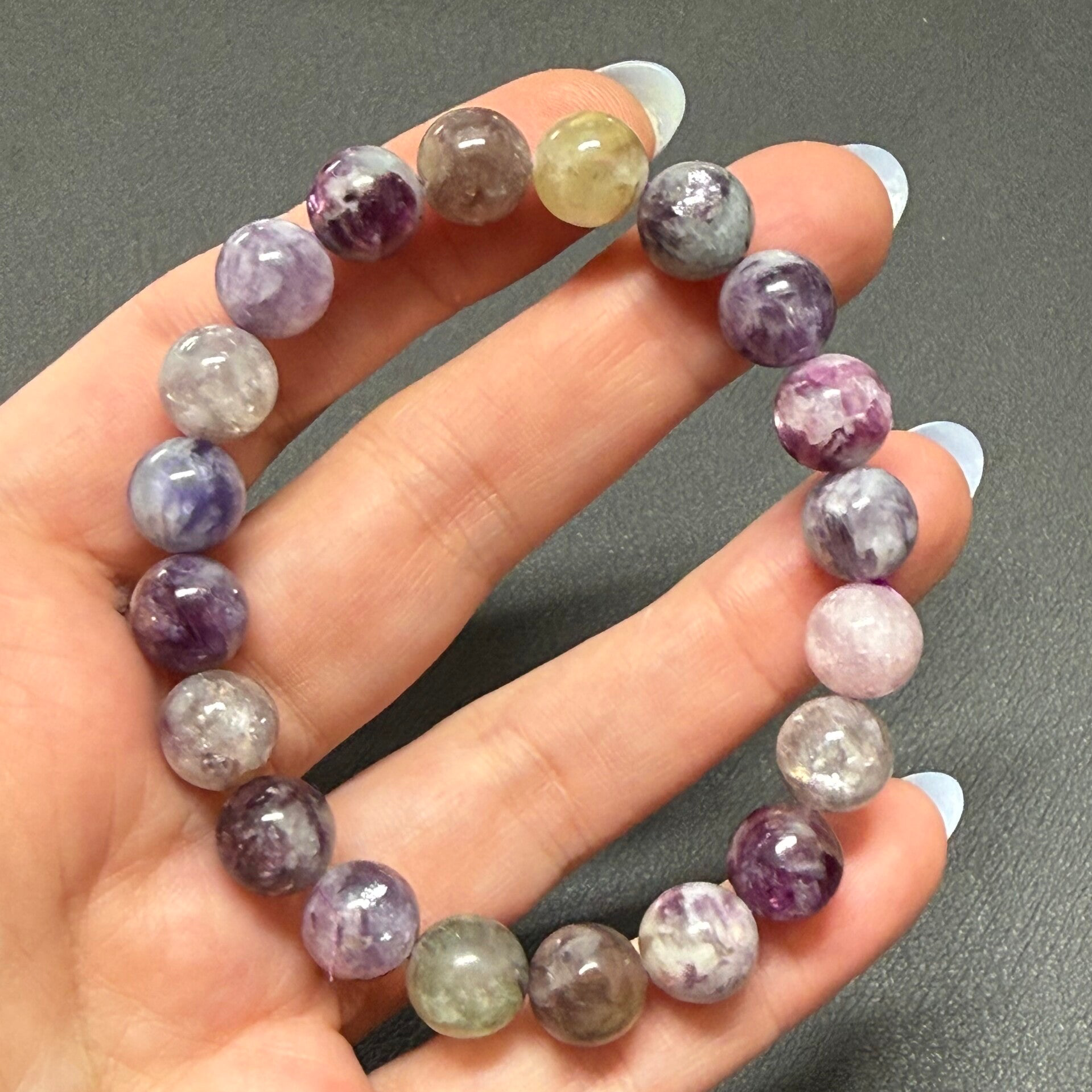 Leuke armband met diverse soorten lepidoliet kralen van 10 mm in afmeting.
