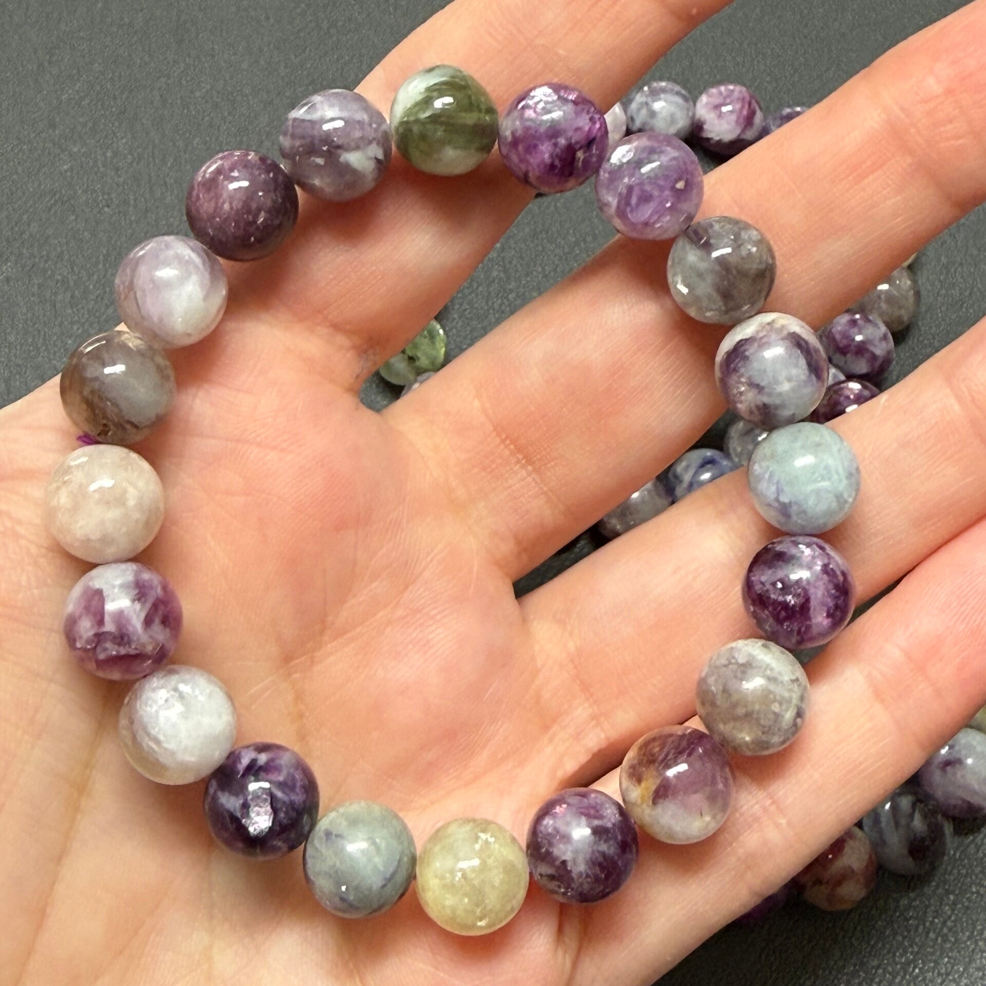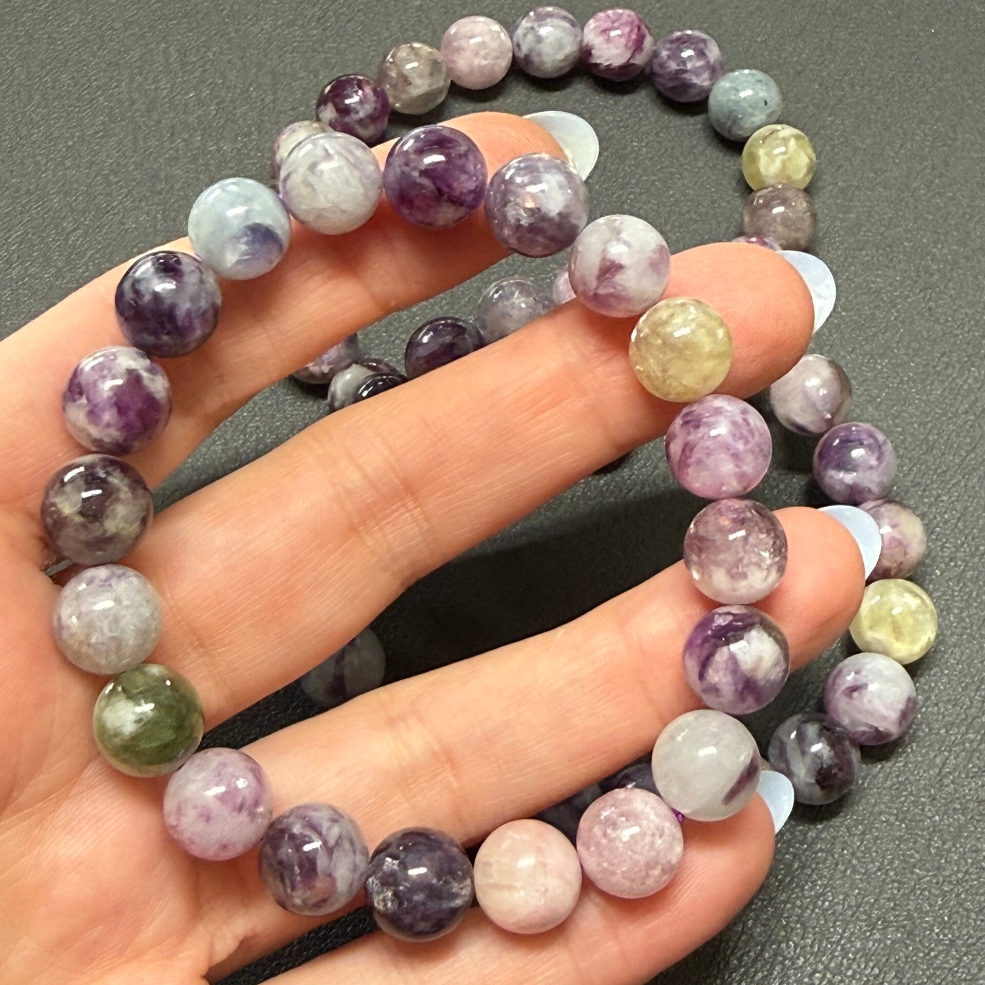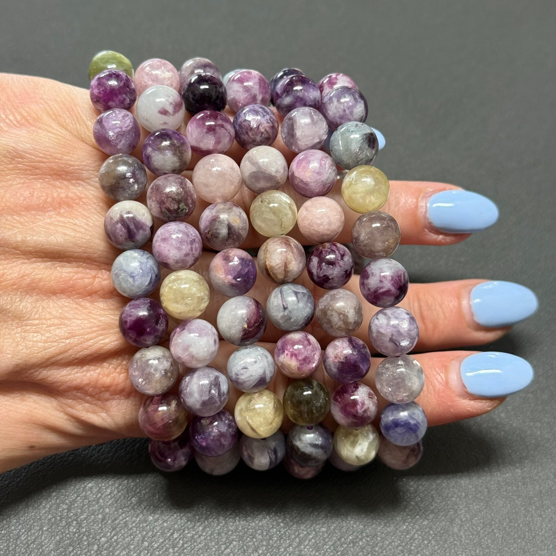 Leuke armband met diverse soorten lepidoliet kralen van 10 mm in afmeting.