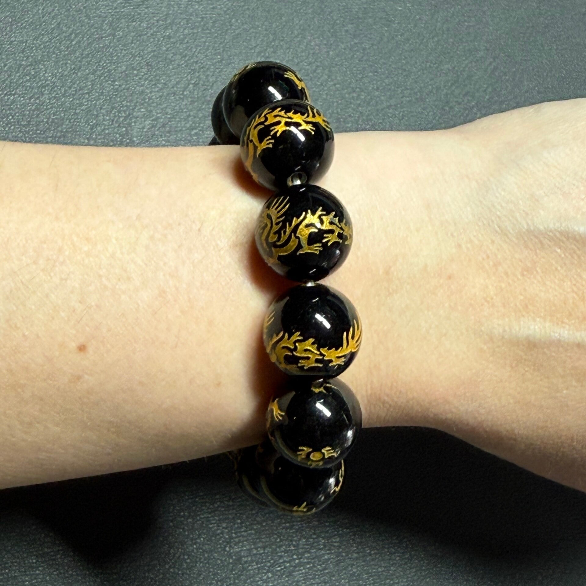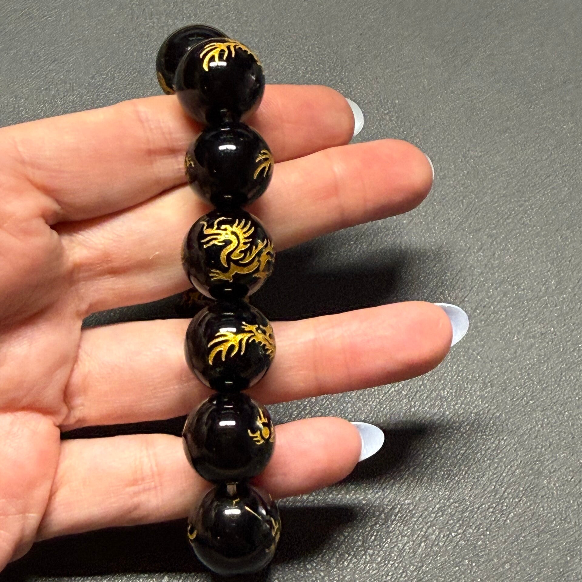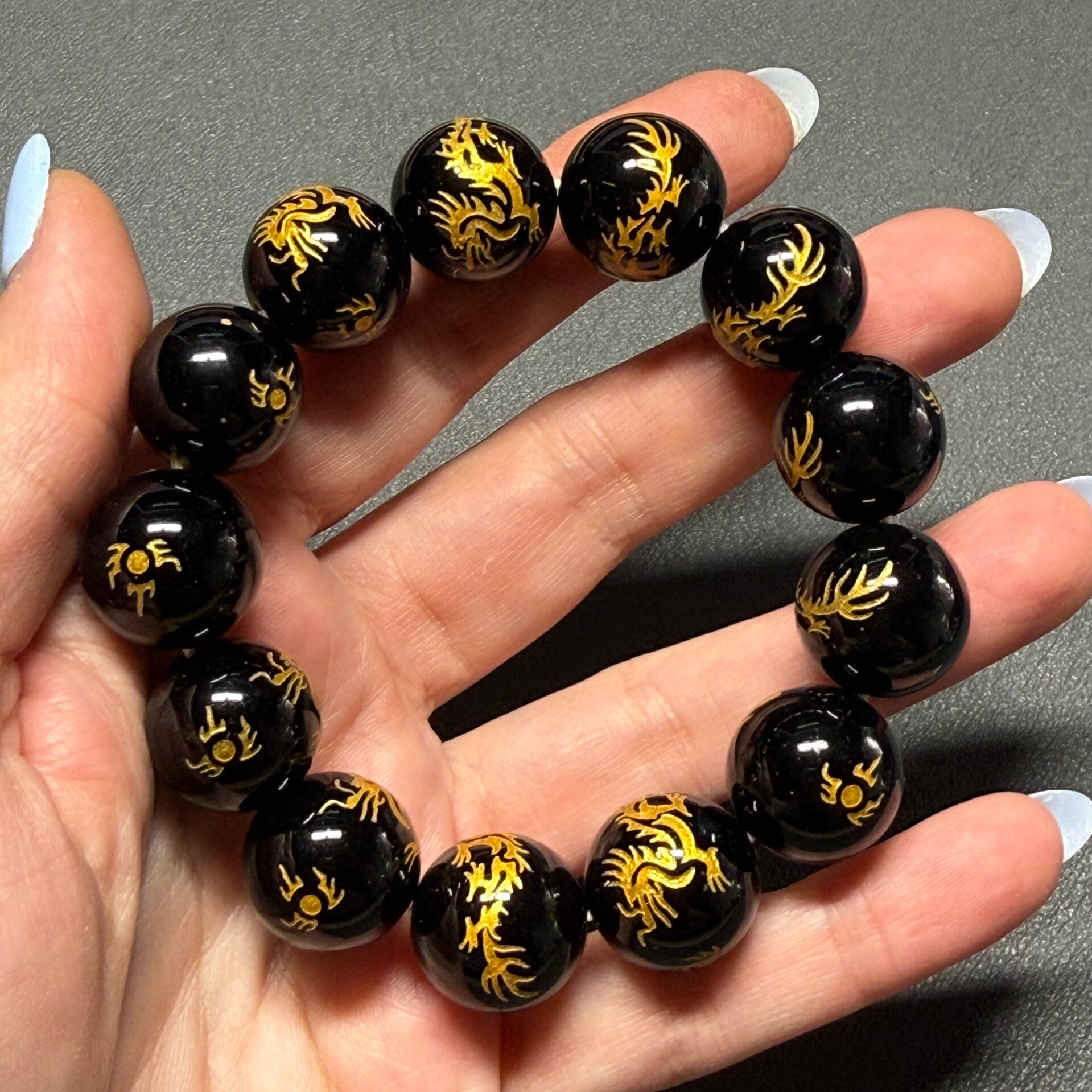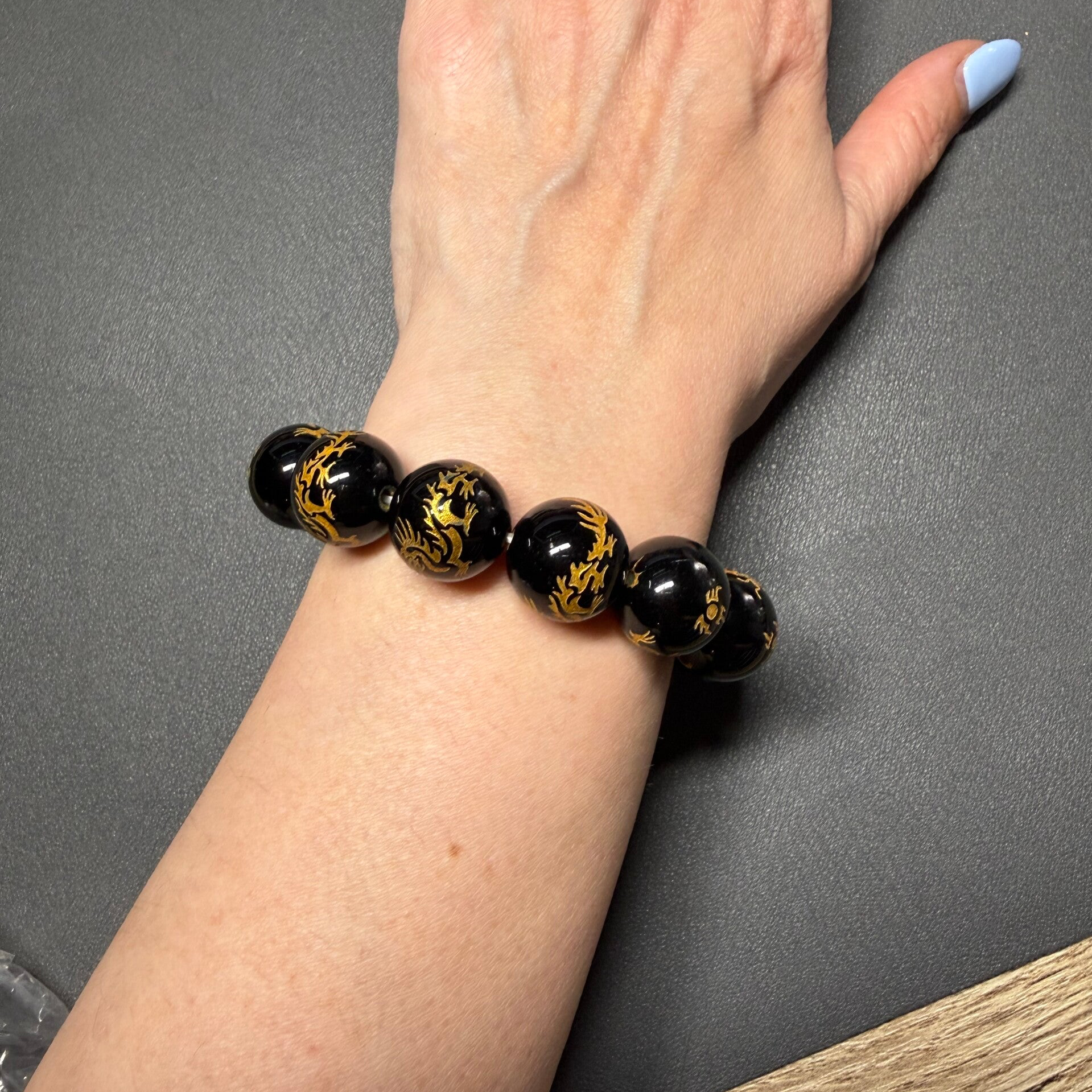 Zwarte agaat armband met draken geëtst en geschilderd in goud op de kralen.