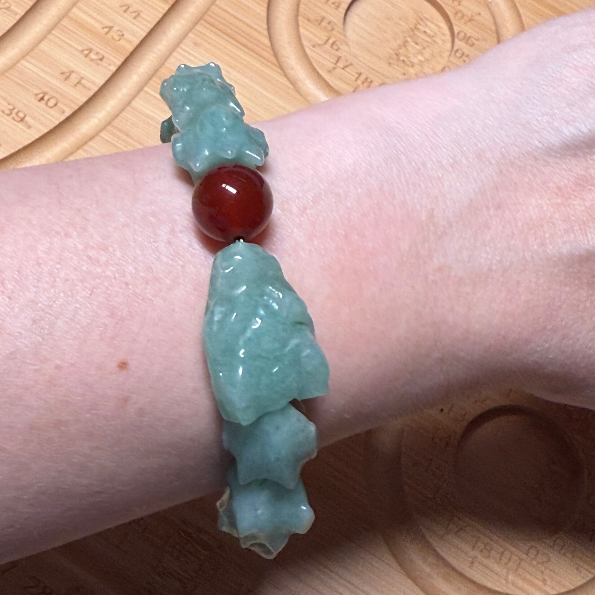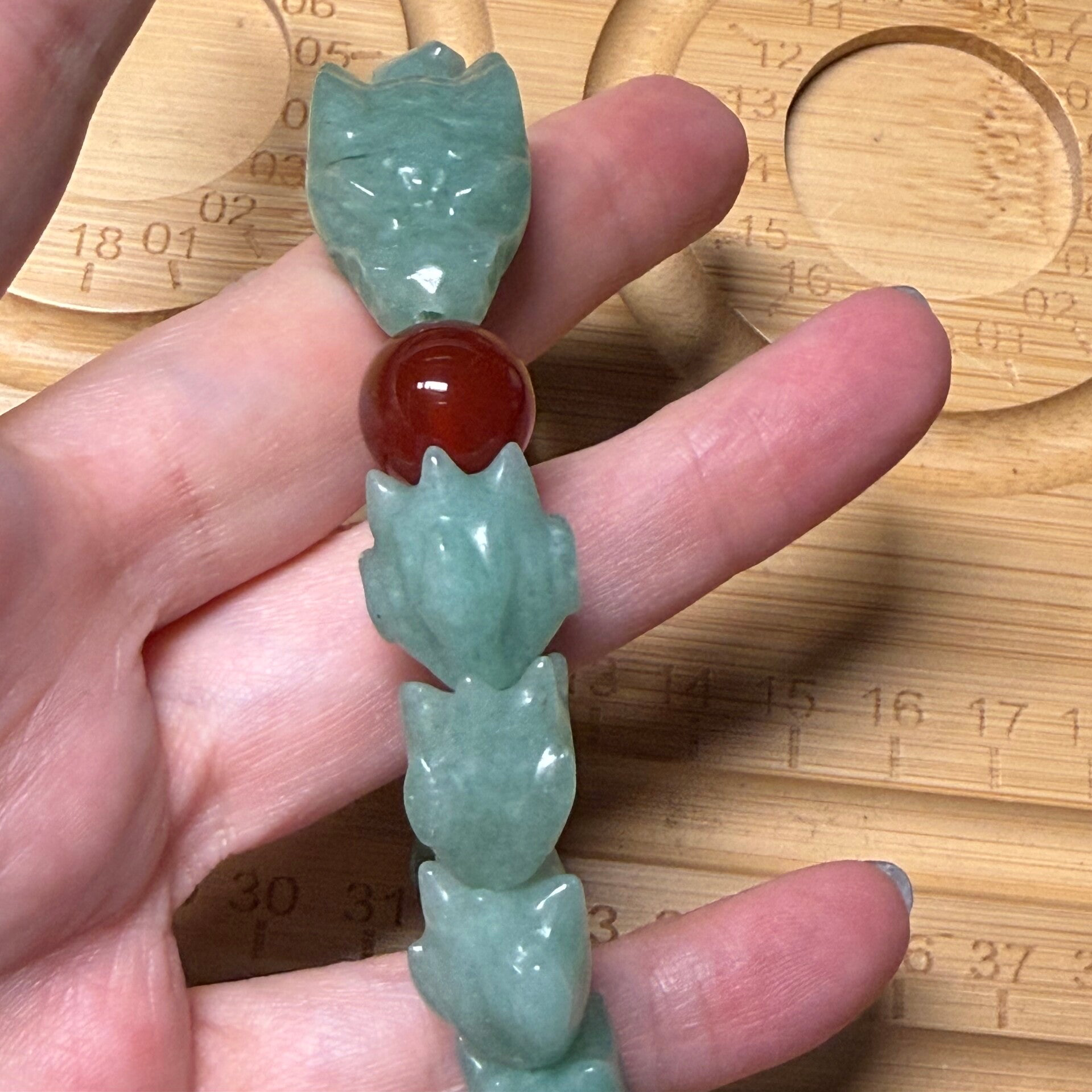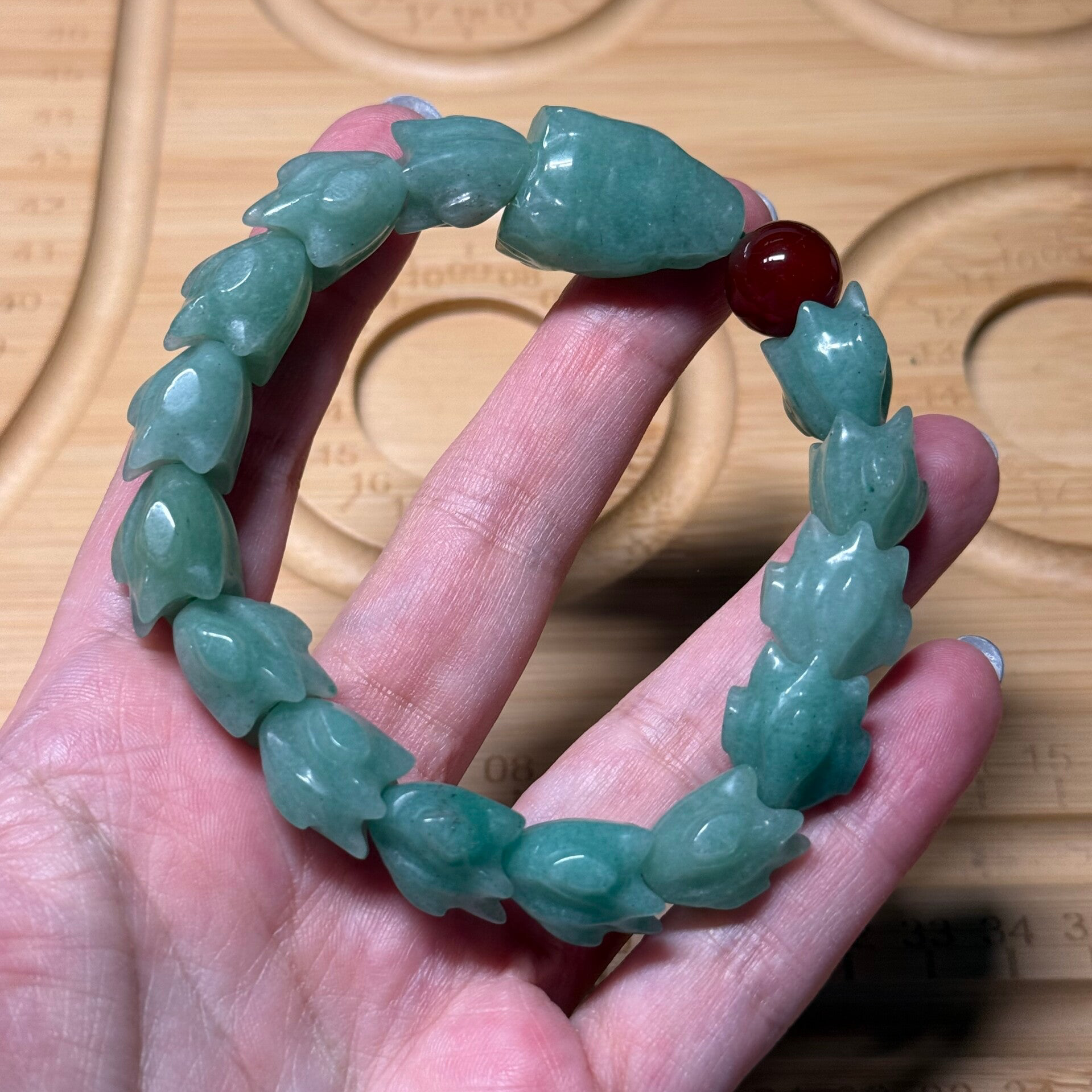 Prachtige armband in draadvormig van groene aventurijn. Met een flaming pearl van Carneool.